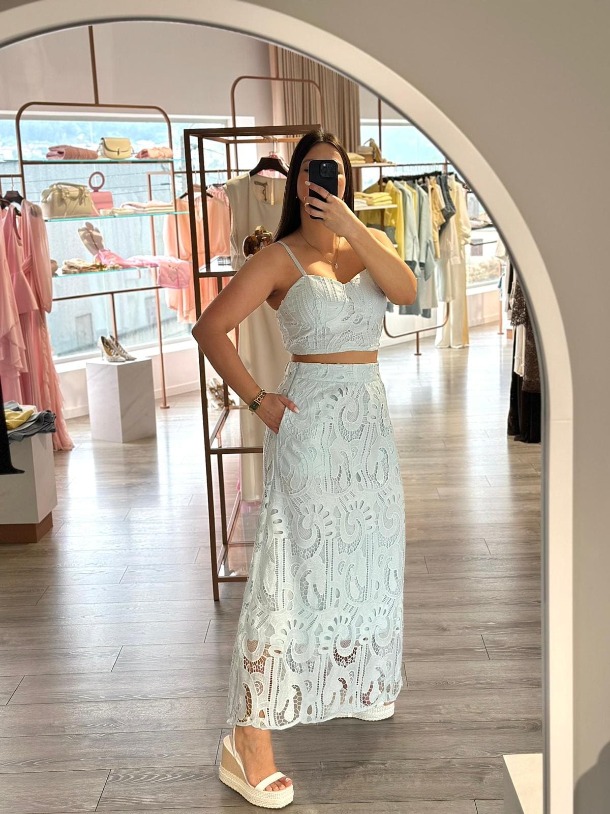 Conjunto azul composto por top e saia em renda trabalhada, totalmente forrado em 100% poliéster, oferecendo conforto, estrutura e segurança ao vestir. Uma peça elegante com um toque contemporâneo, perfeita para looks diferenciados e sofisticados.
