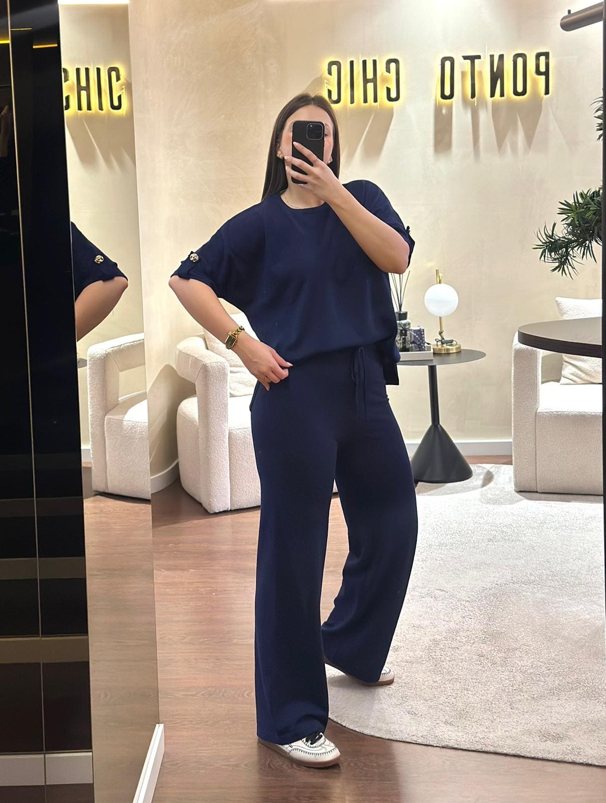 Conjunto azul marinho em malha que combina conforto absoluto com um toque sofisticado, ideal para um dia a dia prático sem abdicar de estilo. Confeccionado em 68% viscose e 32% poliéster, apresenta um toque suave e agradável, com um caimento fluido que acompanha o corpo de forma natural.