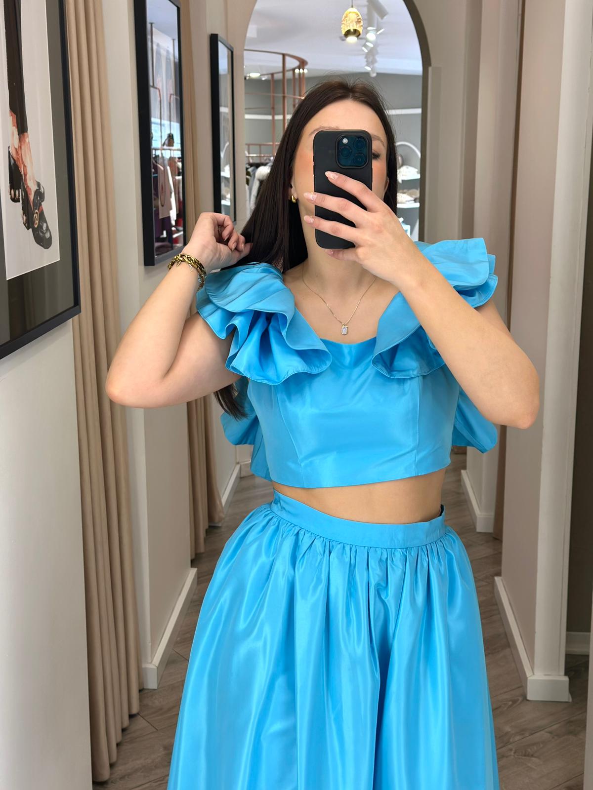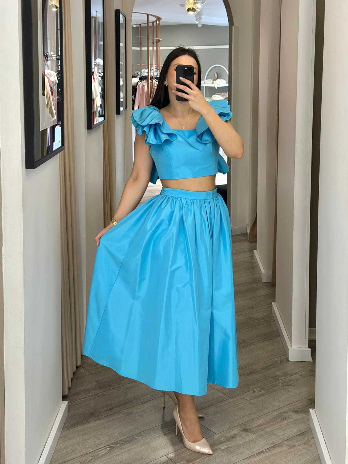 O top apresenta um corte estruturado, com decote direito e mangas curtas aveludadas em efeito folho, que acrescentam volume e um toque romântico à peça. Na parte de trás, ajusta ao corpo através de fecho invisível, garantindo um acabamento limpo e elegante.