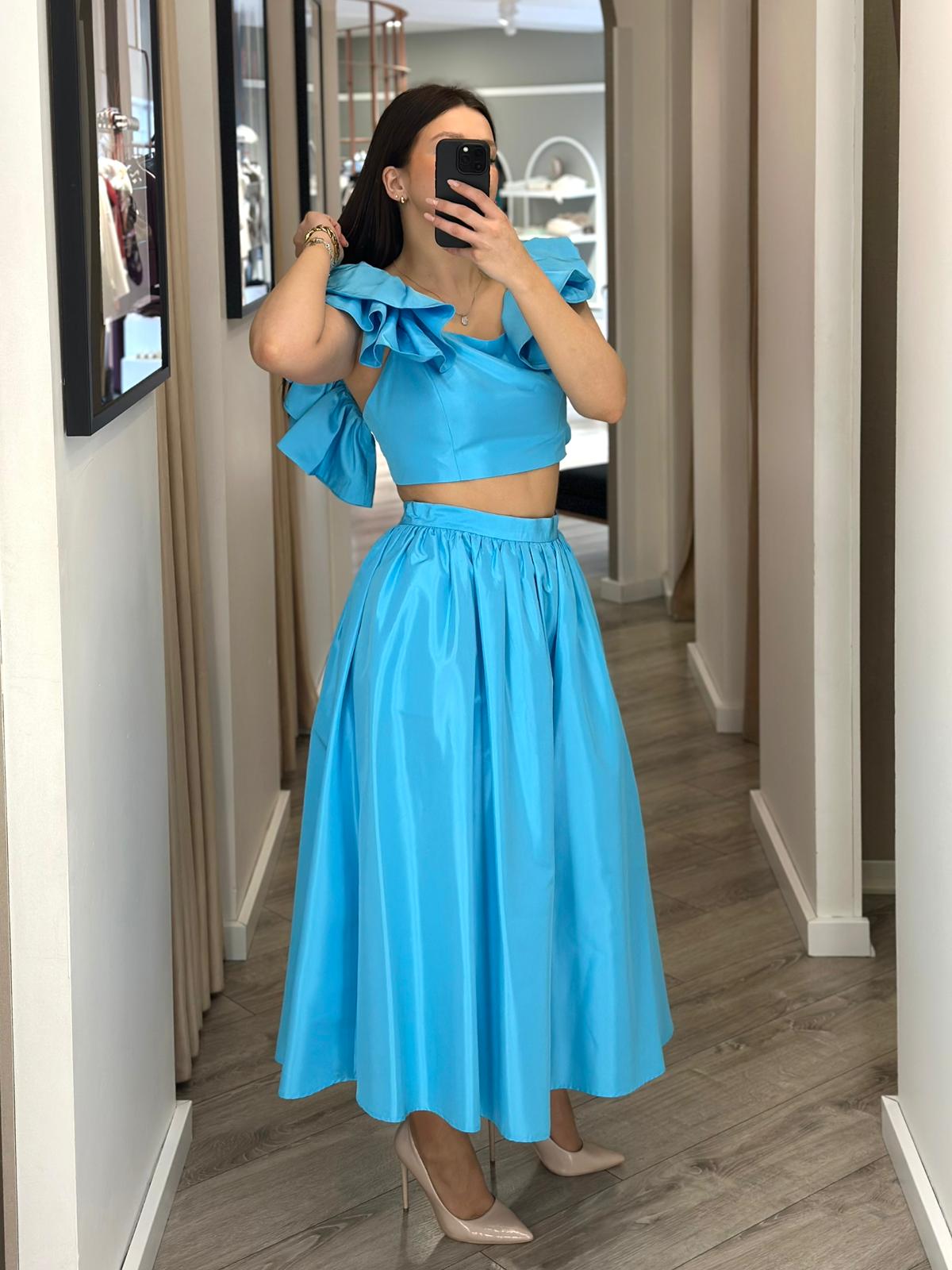 Conjunto elegante e feminino composto por top estruturado e saia fluida, ideal para ocasiões especiais, cerimónias ou eventos onde a sofisticação faz a diferença. Confeccionado em 100% poliéster, destaca-se pelo caimento leve e pelo movimento delicado do tecido.