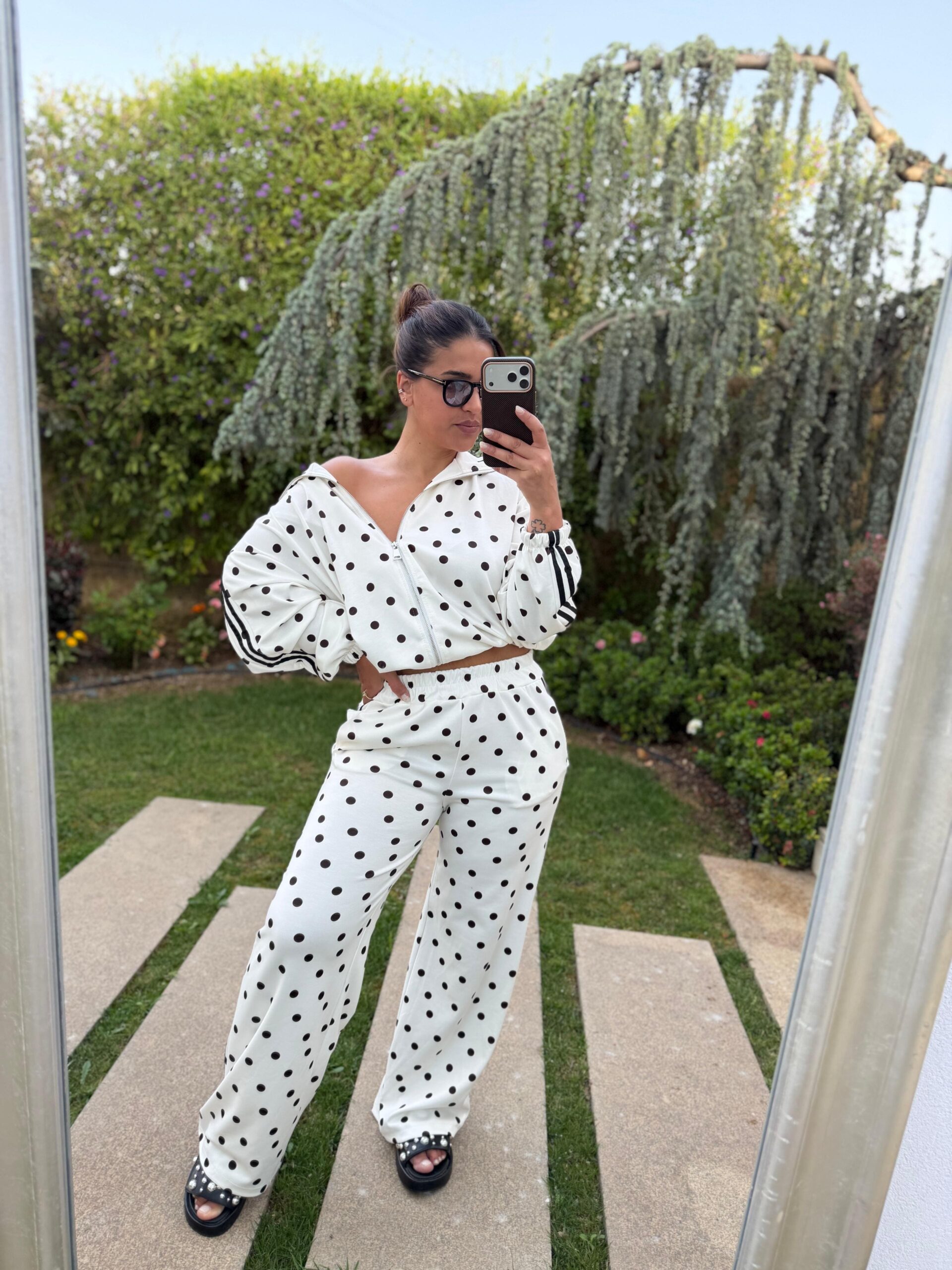 Conjunto branco às bolinhas Ponto Chic, confecionado em tecido leve e confortável (55% poliéster, 39% viscose e 6% elastano), ideal para um look descontraído mas com presença. O casaco conta com bolsos funcionais e fecho frontal, enquanto a calça também apresenta bolsos laterais, garantindo praticidade no dia a dia.