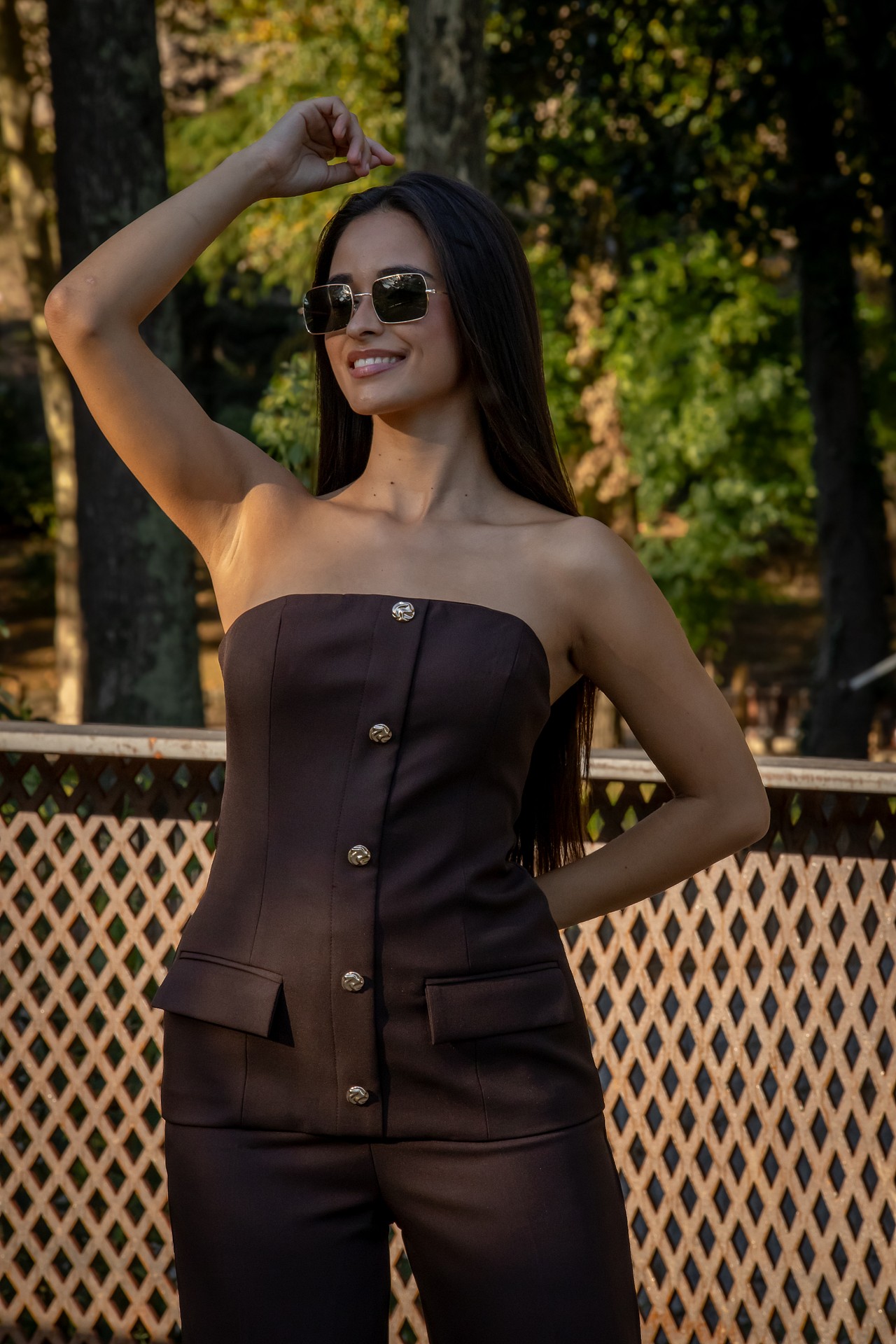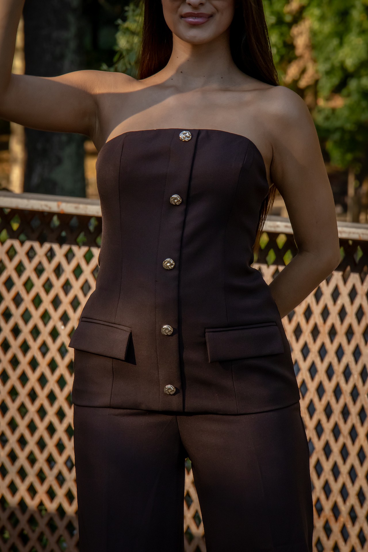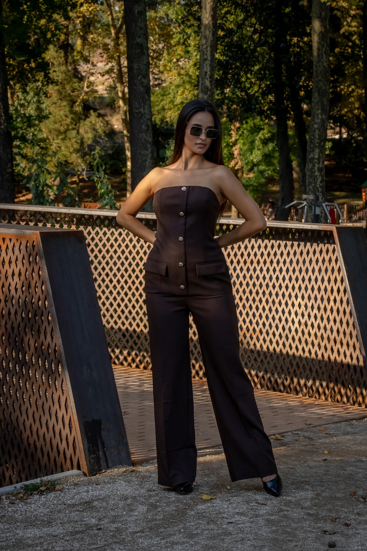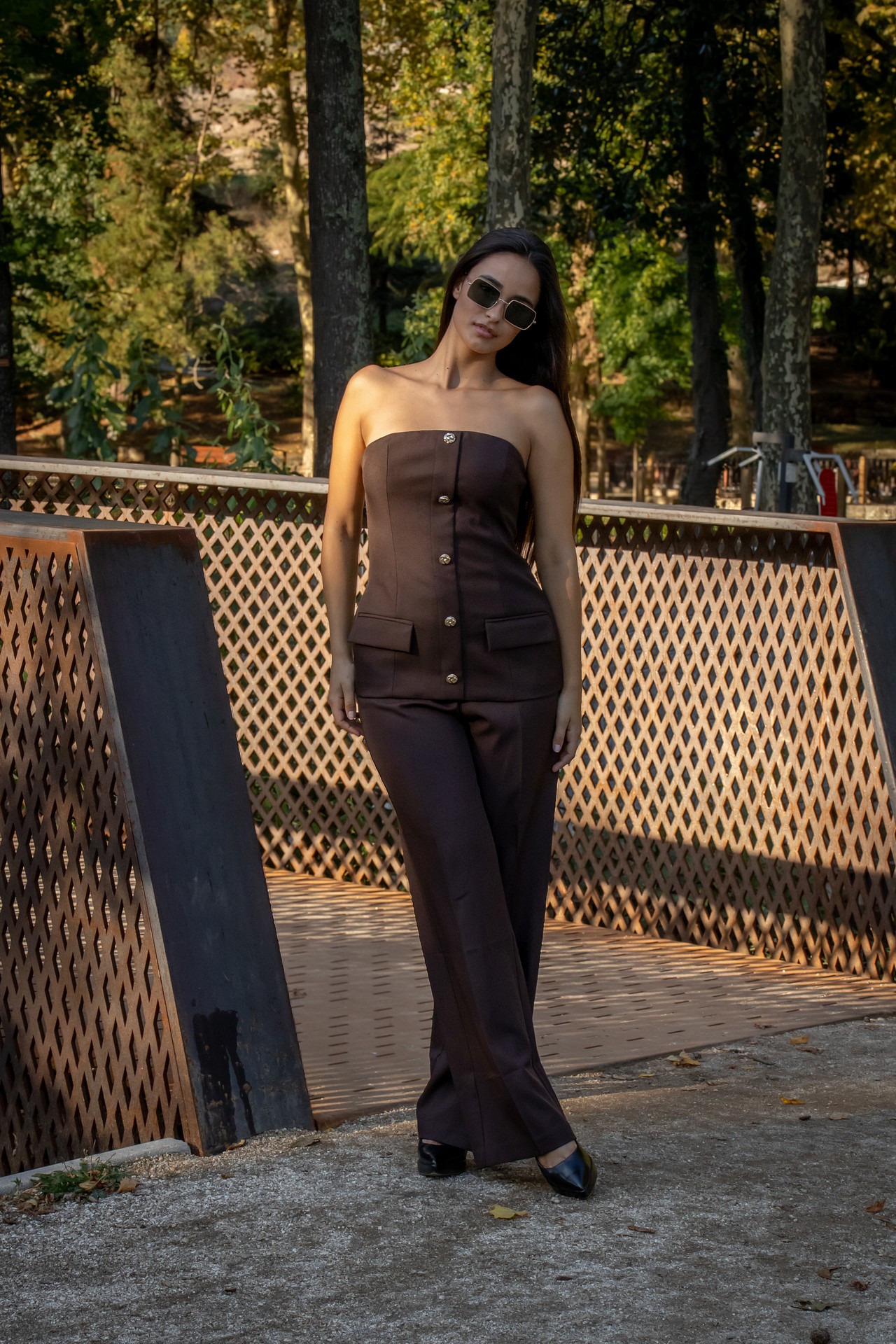 CONJUNTO CASTANHO CORPETE E CALÇA PONTO CHIC