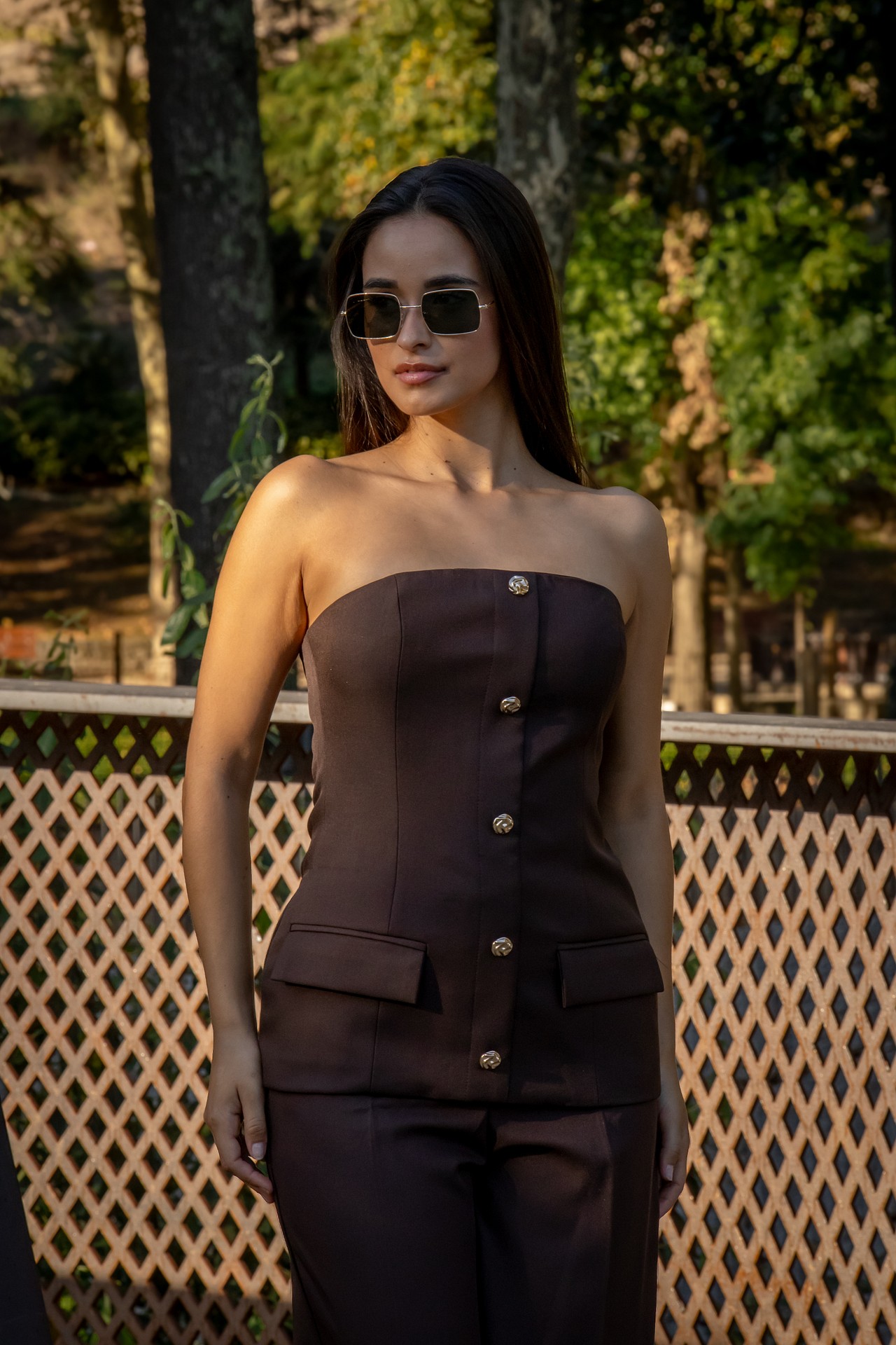 O colete estruturado apresenta botões dourados de destaque e bolsos decorativos, acrescentando requinte e originalidade ao design. A calça de corte reto, com cintura média e pinças discretas, garante um visual elegante e intemporal.