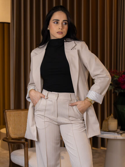 O blazer apresenta lapela clássica, fecho frontal por botão e corte direito, criando uma silhueta elegante e imponente. As mangas com dobra revelam forro interior riscado, um detalhe diferenciador que acrescenta personalidade, modernidade e sofisticação ao design.