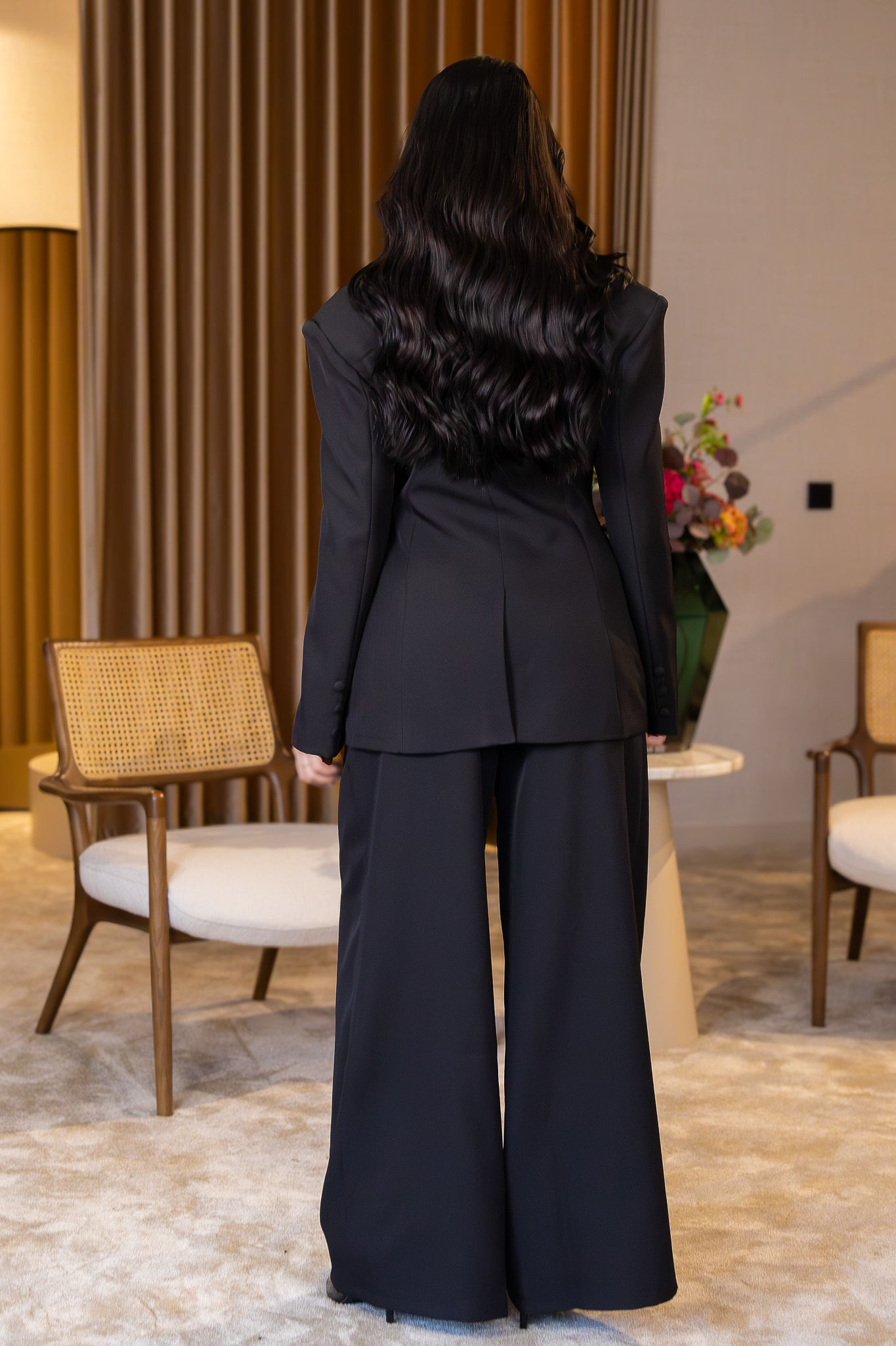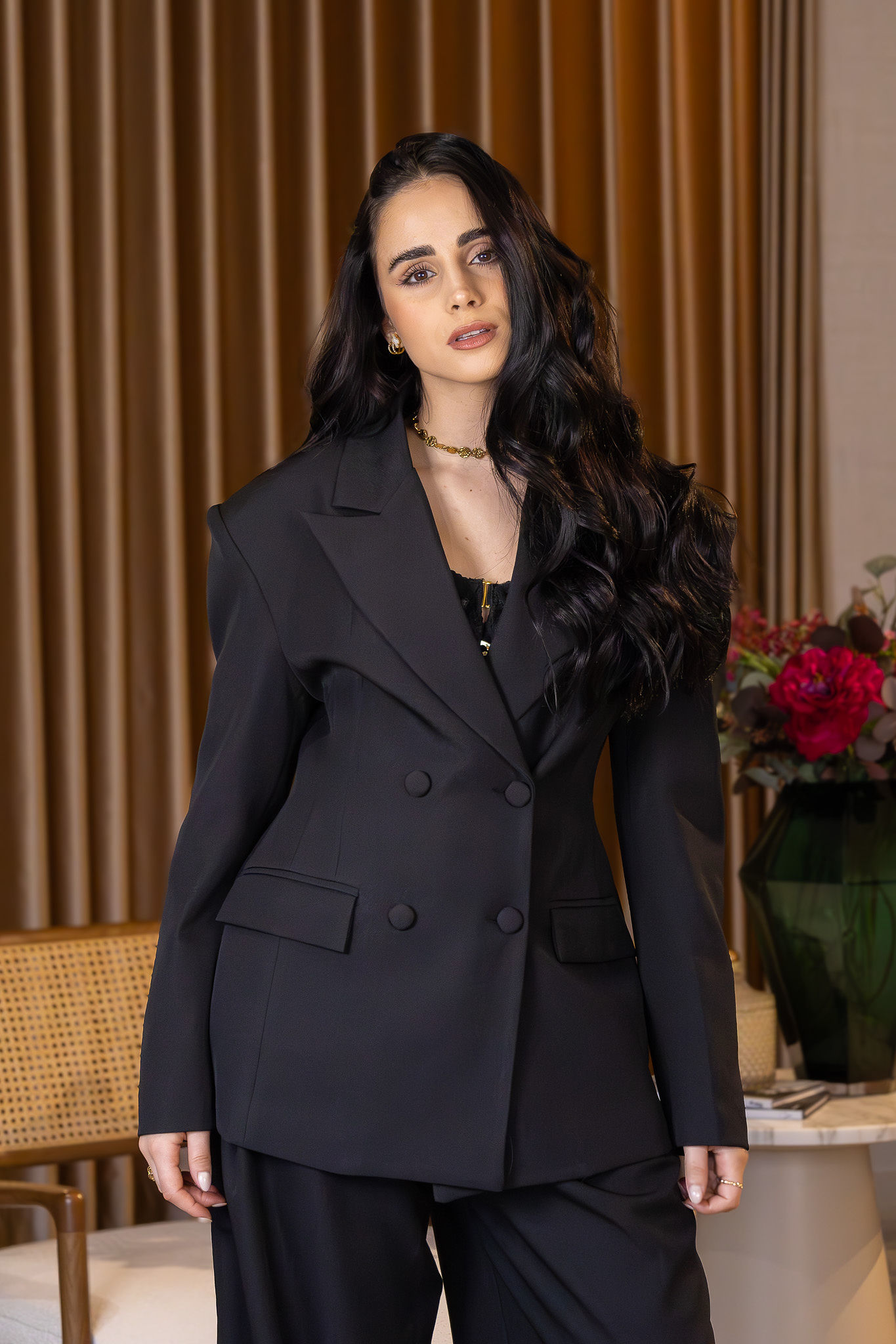 Conjunto de alfaiataria em tom preto, composto por blazer de abotoamento em forma de trespasse e calça de corte clássico a condizer, criando uma silhueta elegante, forte e intemporal. Uma proposta de estética sofisticada e contemporânea, pensada para uma mulher segura, elegante e com identidade.
