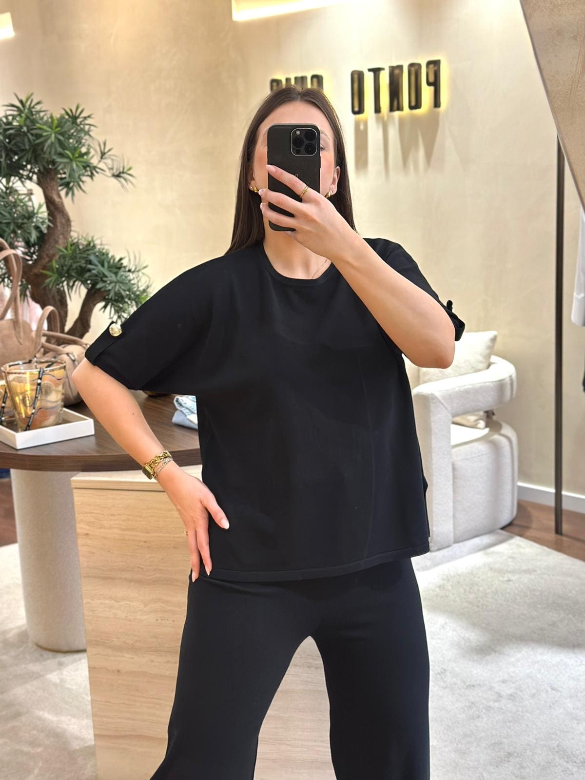 Conjunto preto em malha que combina conforto absoluto com um toque sofisticado, ideal para um dia a dia prático sem abdicar de estilo. Confeccionado em 68% viscose e 32% poliéster, apresenta um toque suave e agradável, com um caimento fluido que acompanha o corpo de forma natural.