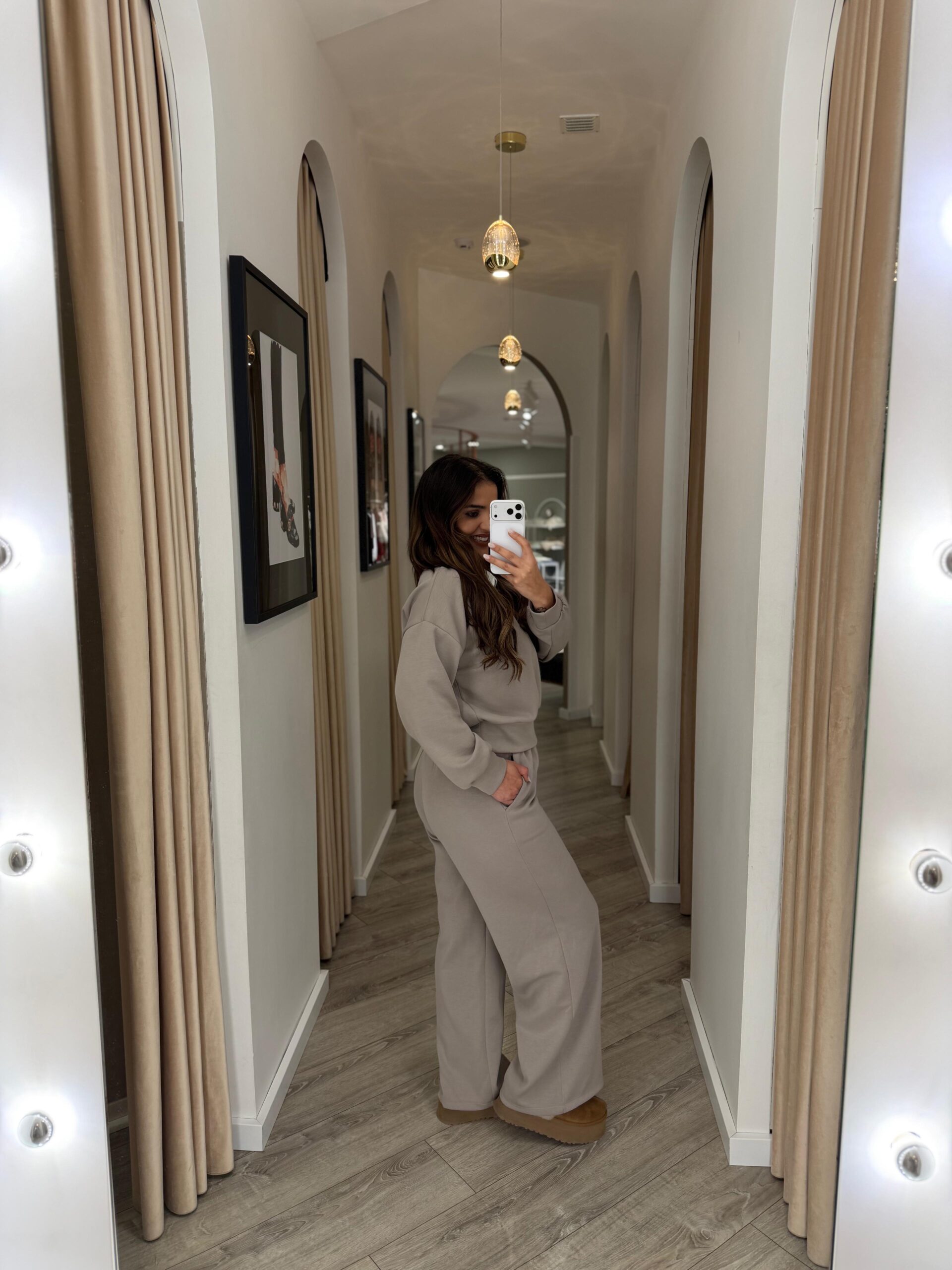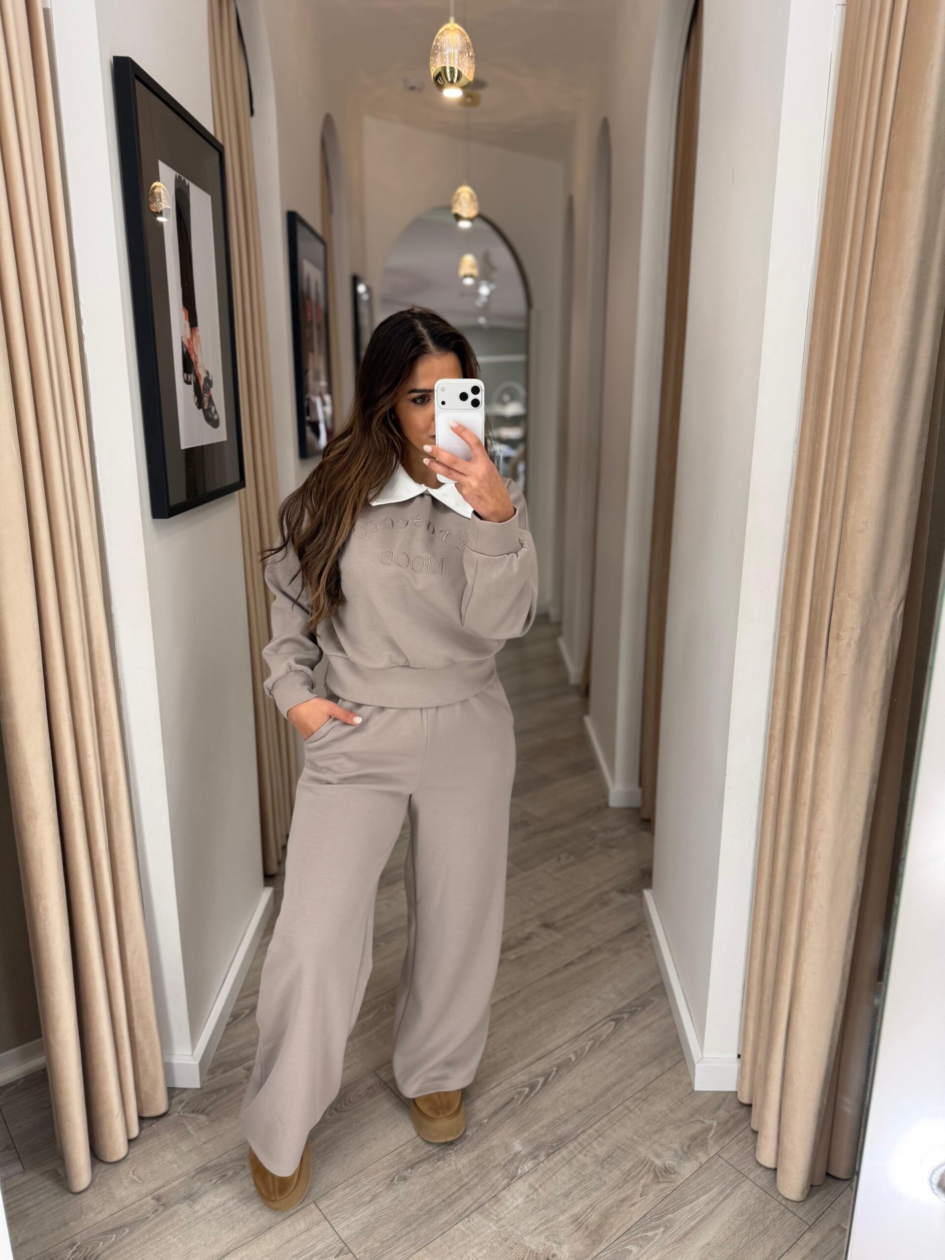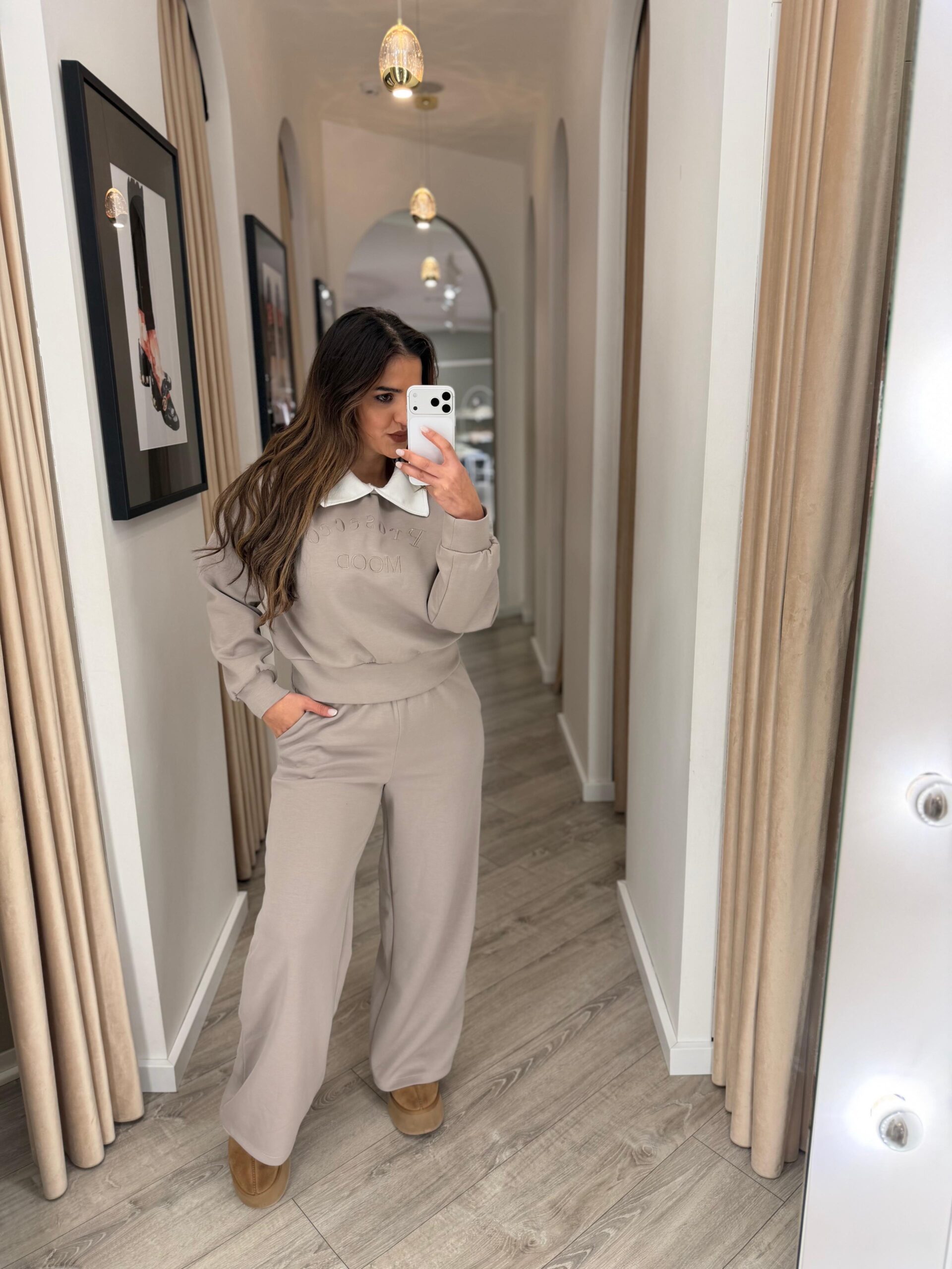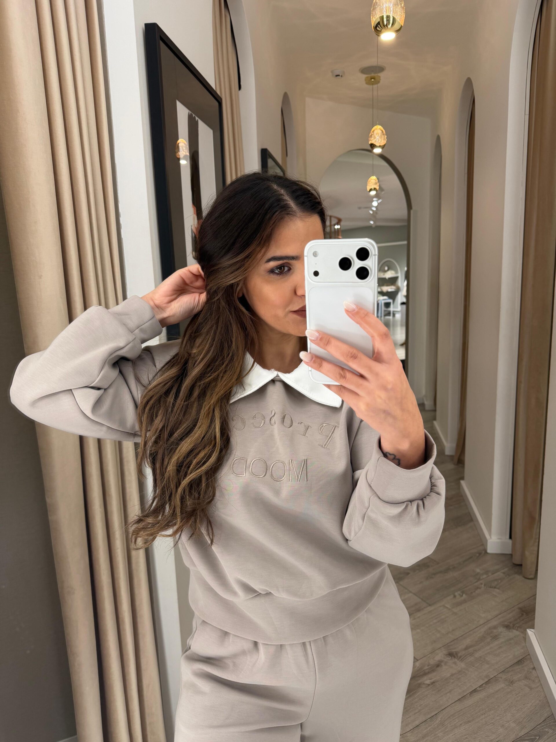 Conjunto feminino composto por sweatshirt e calça de corte fluido, em tom taupe elegante e sofisticado, com gola branca contrastante que acrescenta estrutura e um apontamento contemporâneo ao coordenado.
