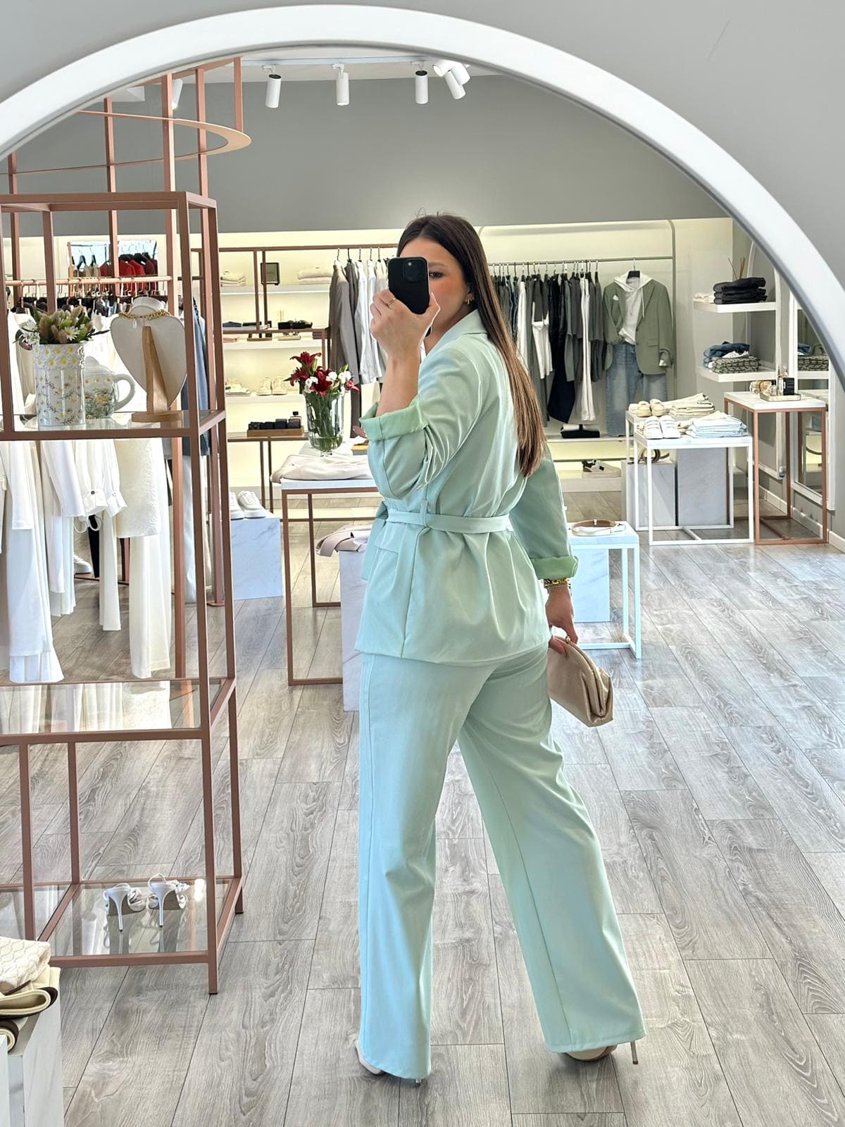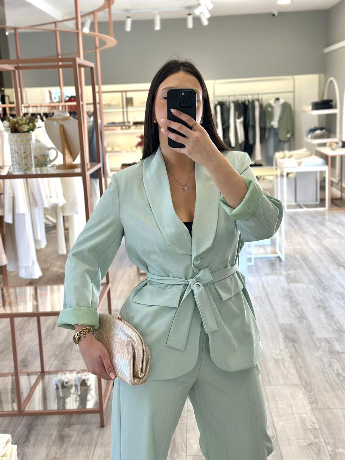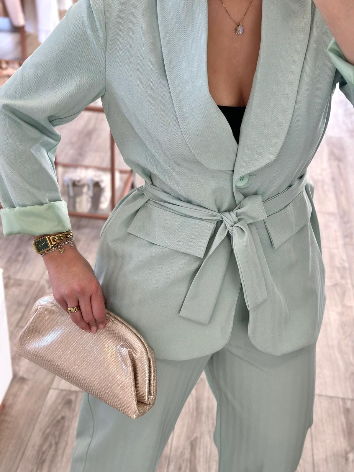 Este conjunto verde água destaca-se pela sua elegância contemporânea e pelo equilíbrio entre conforto e sofisticação. Confeccionado em 96% poliéster e 4% elastano, apresenta um tecido estruturado, confortável e ligeiramente elástico que garante um excelente caimento. O tecido evidencia ainda um padrão subtil em espinha (tipo alinhado) que acrescenta textura e profundidade ao visual, criando um efeito discreto mas sofisticado.