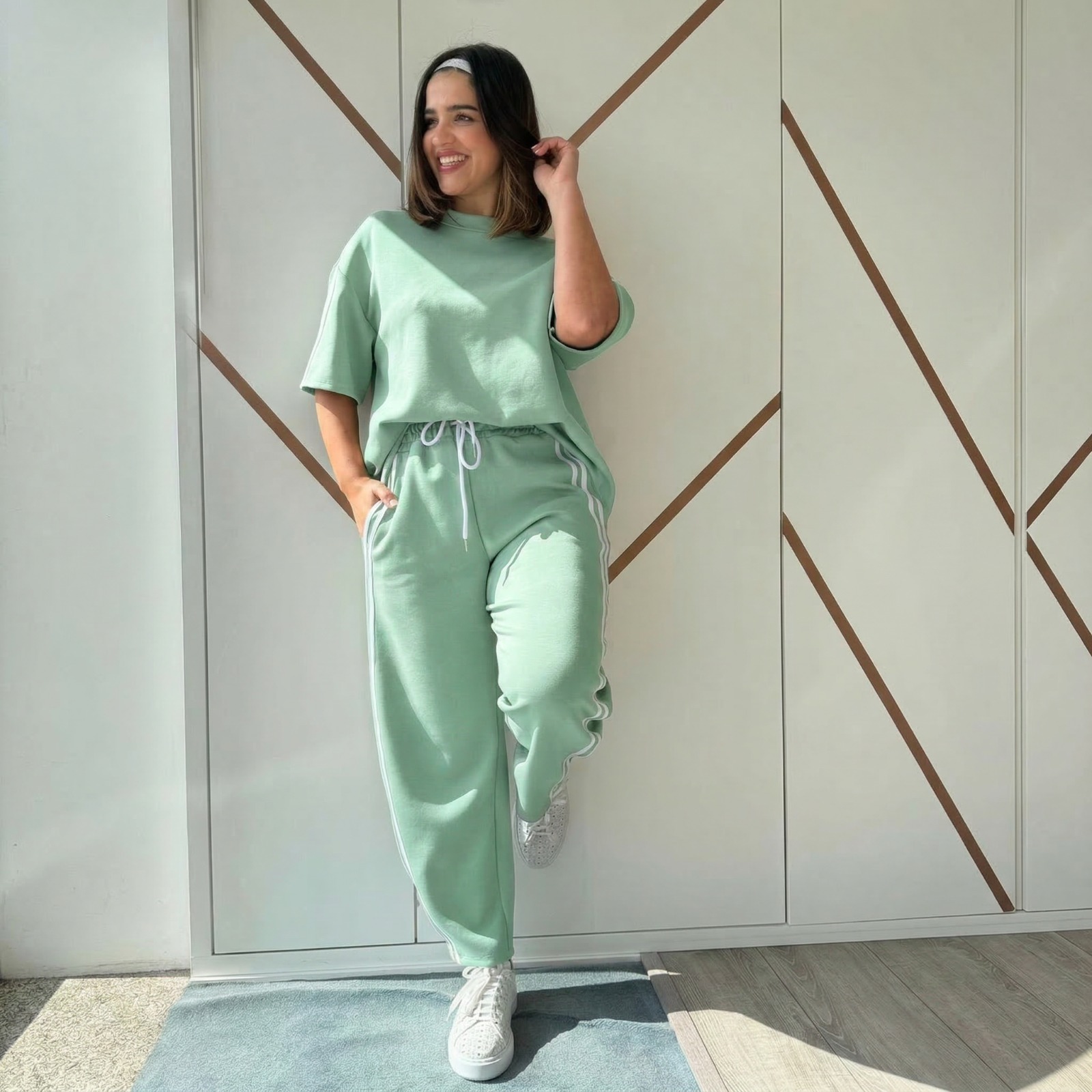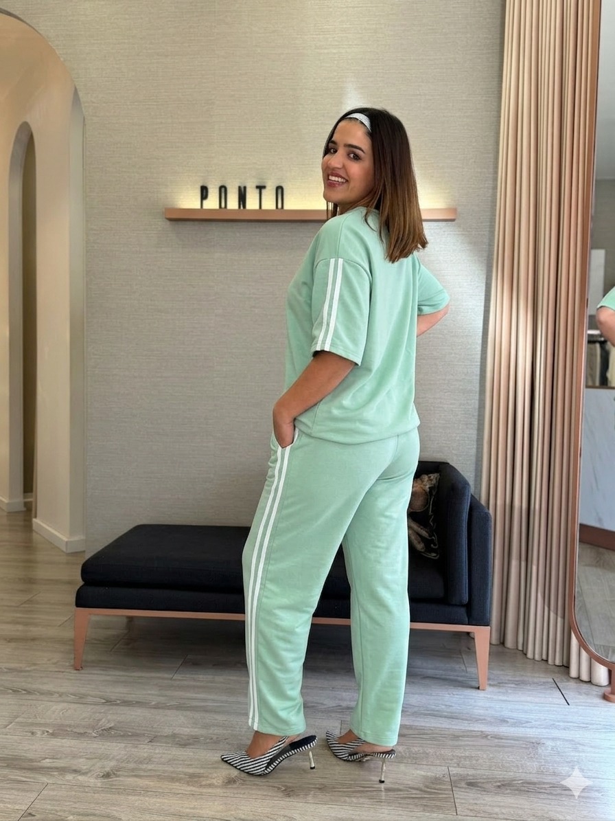 Conforto e estilo unem-se neste conjunto verde, perfeito para um look descontraído mas sempre atual. Composto por sweat de corte solto e calça com faixa lateral, é uma proposta moderna que combina bem-estar com uma estética desportiva e elegante.