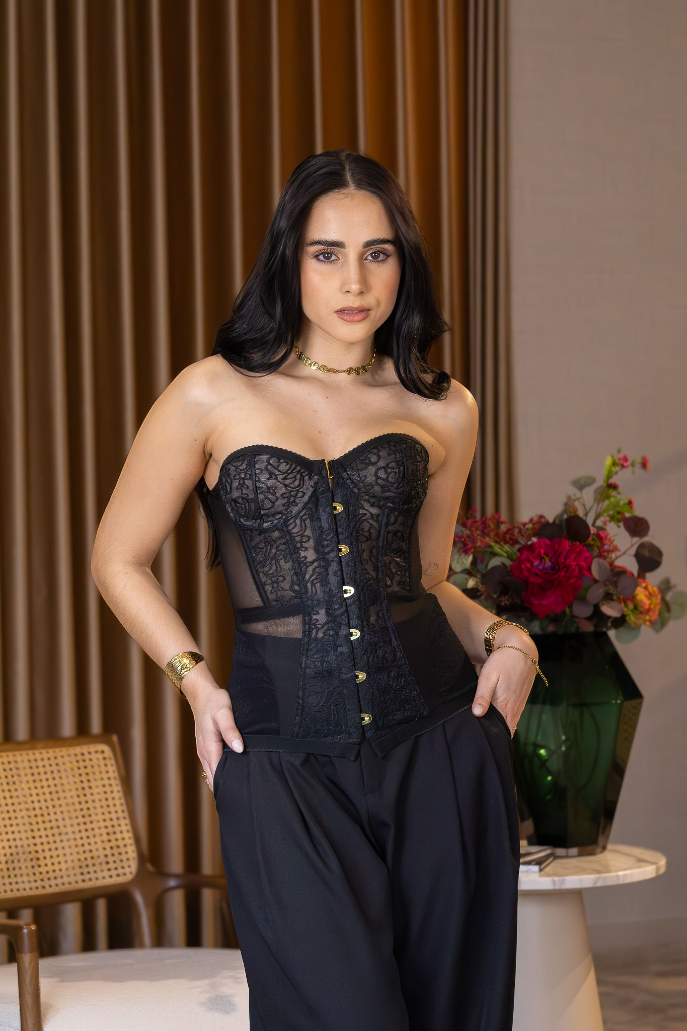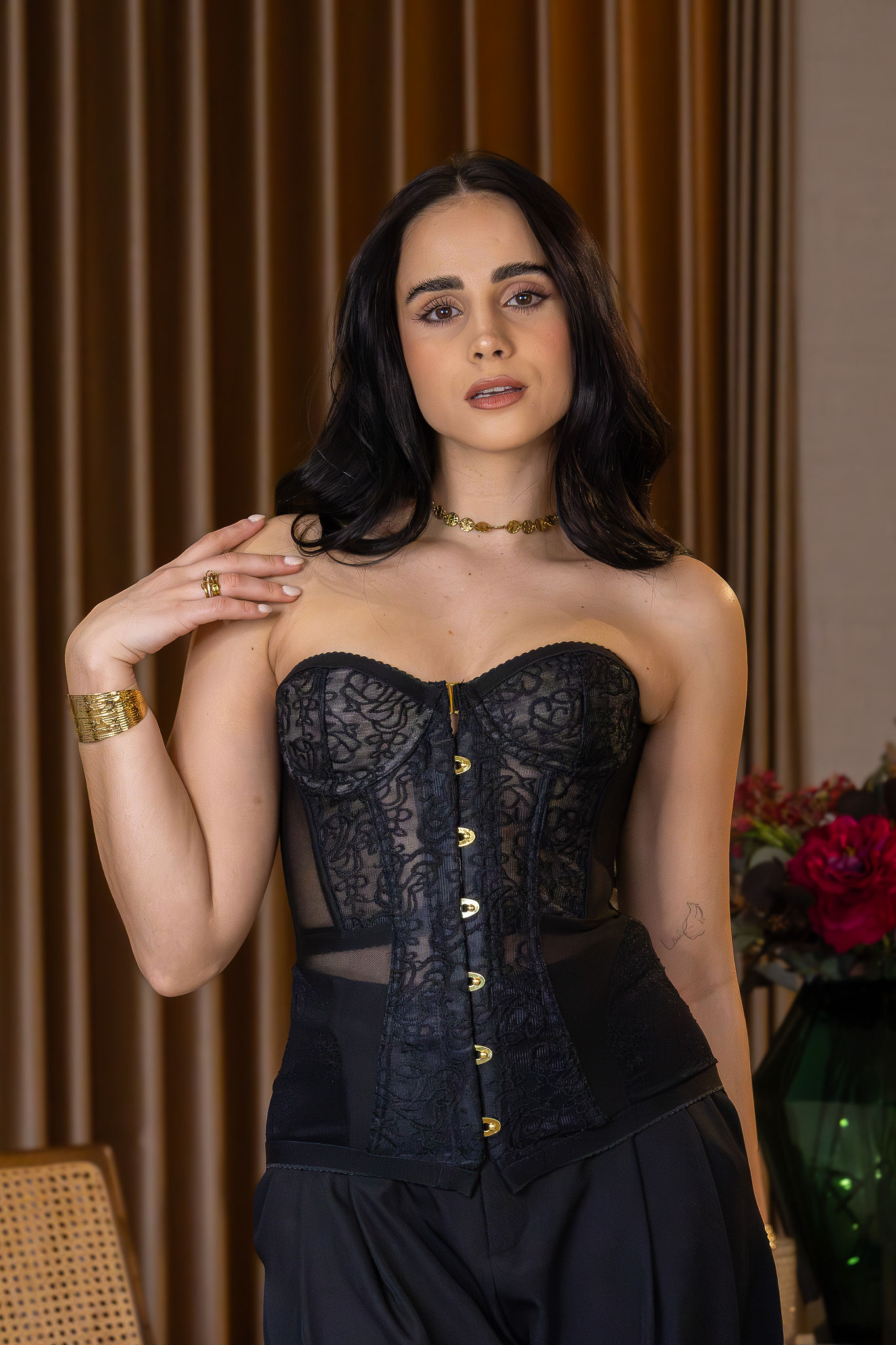 A construção estruturada define e valoriza a silhueta, criando um efeito modelador natural que realça a cintura e o tronco com elegância e precisão. A frente apresenta um fecho com colchetes metálicos dourados, que acrescentam um detalhe de requinte e um contraste sofisticado com a profundidade do tom preto.