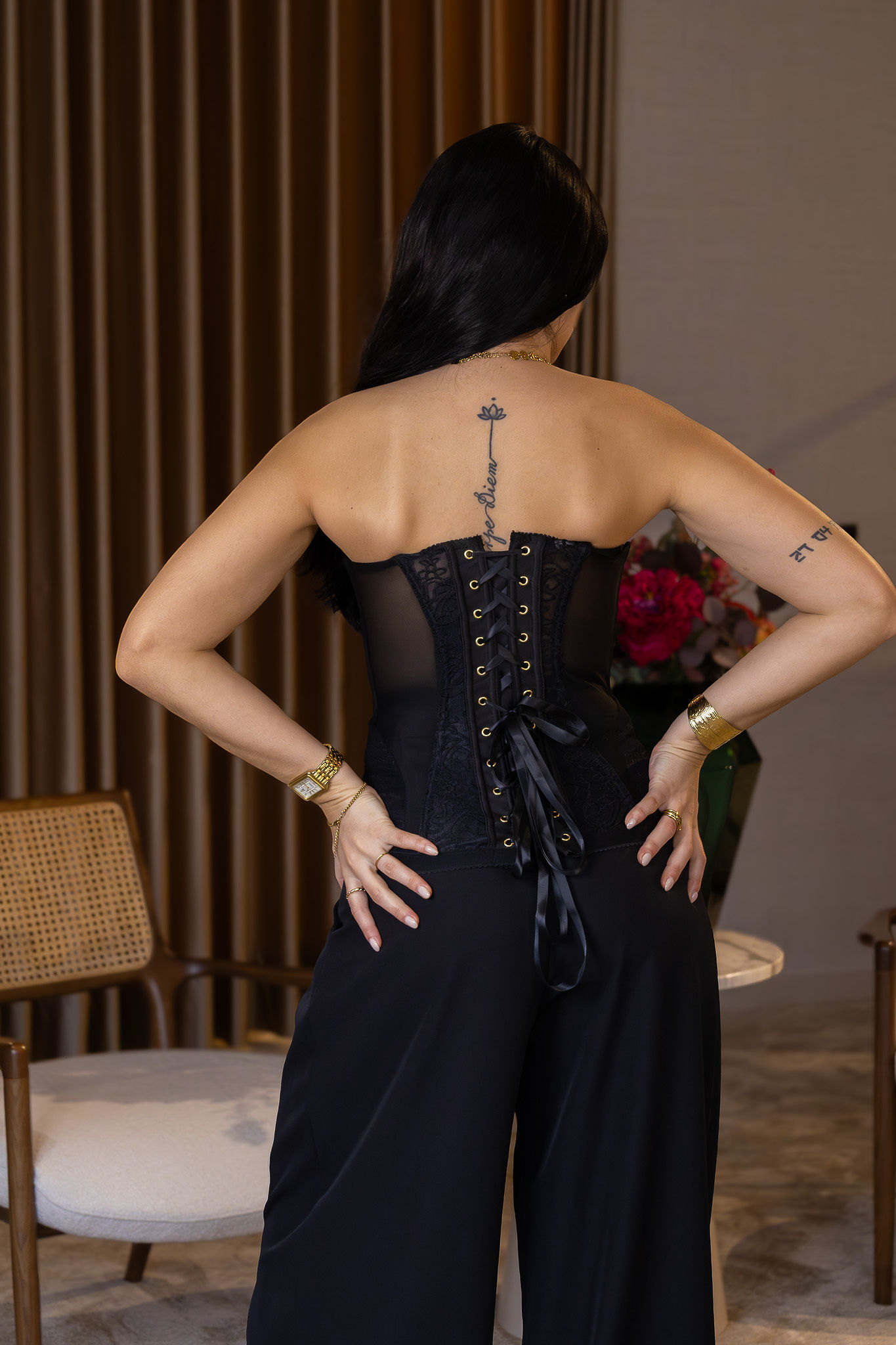 Nas costas, o modelo destaca-se pelo ajuste em forma de trespasse com cordão, permitindo adaptar o corpete ao corpo de forma personalizada, garantindo encaixe perfeito, conforto e valorização da silhueta. Este sistema de aperto confere não só funcionalidade, mas também uma forte assinatura estética de inspiração corset clássica.