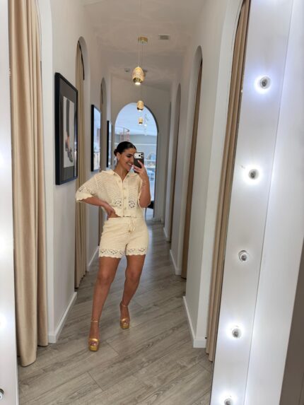 Uma peça tendência que combina o melhor de dois mundos: a estrutura de uma calça com a leveza de um comprimento mais curto. O tom azul claro traz frescura e um ar moderno ao look.