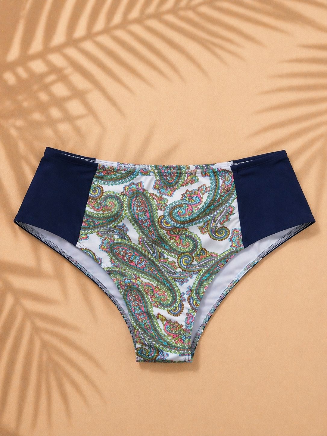 Cueca de biquíni com padrão paisley multicolor sobre fundo claro, combinada com laterais em tom azul, confecionada em tecido elástico que garante conforto e adaptação ao corpo (82% poliéster, 18% elastano).