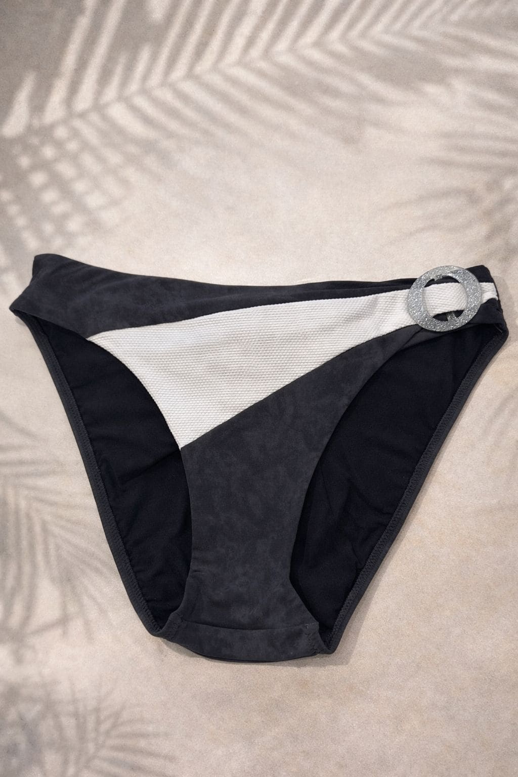 Esta cueca de biquíni da Ponto Chic destaca-se pelo contraste elegante entre o preto e o branco texturado, criando um efeito moderno e sofisticado. Confeccionada em tecido elástico, garante conforto, adaptação ao corpo e liberdade de movimentos.
