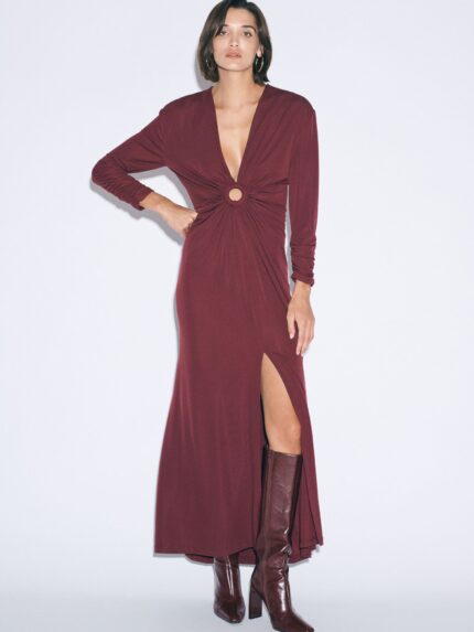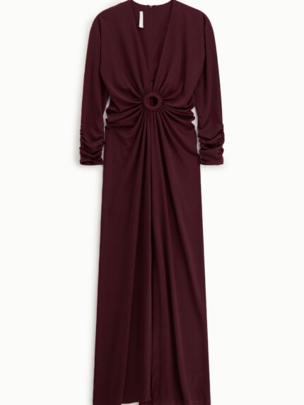 VESTIDO LONGO ROXO COM PORMENOR DE ARGOLA E DRAPEADO IMPERIAL