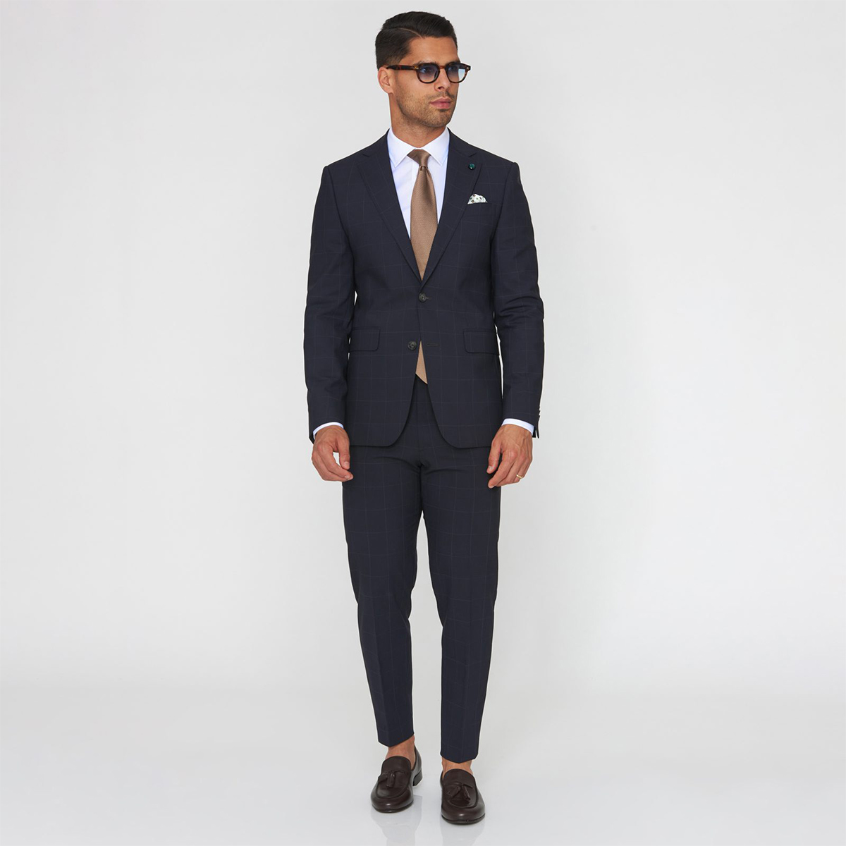 O fato azul escuro da Zolf distingue-se pelo seu padrão discreto aos quadros e pela elegância clássica que transmite em qualquer ocasião. Confeccionado em 53% poliéster, 43% lã e 4% elastano, oferece uma combinação equilibrada entre estrutura, conforto e respirabilidade.