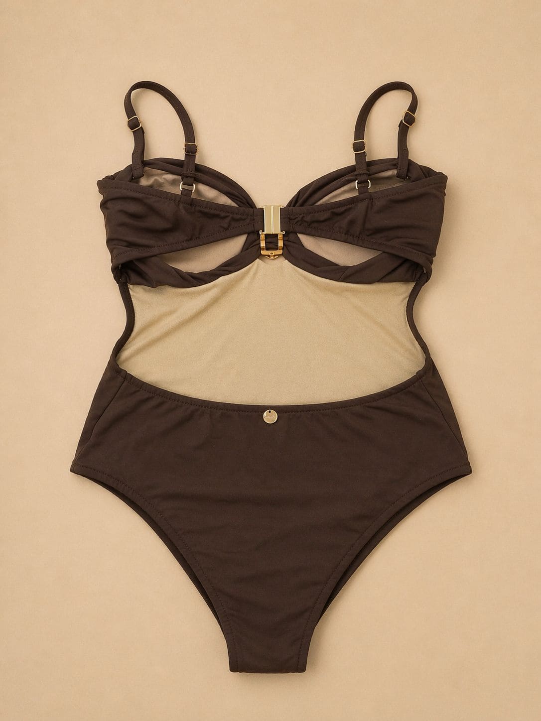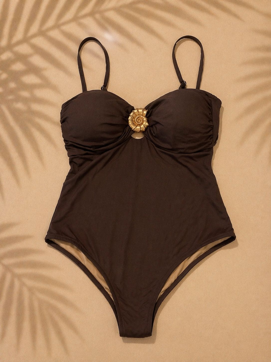 Fato de banho castanho com design elegante e sofisticado, ideal para um look de praia moderno e feminino. Confeccionado em 90% poliamida e 10% elastano, com forro 100% poliéster, apresenta um tecido confortável, com elasticidade e excelente adaptação ao corpo.