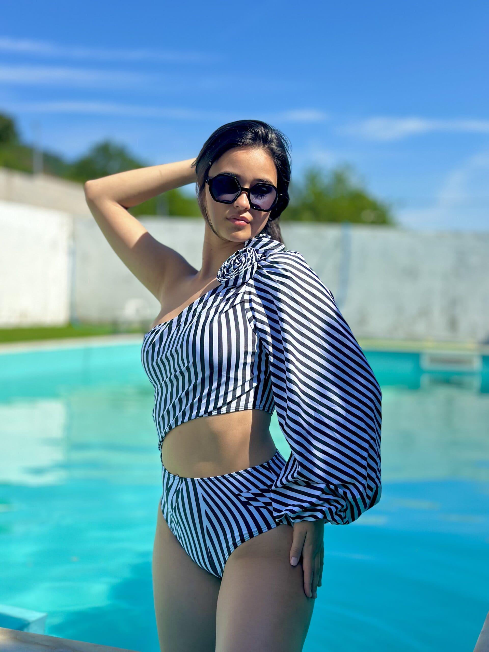 Este conjunto fato de banho da Ponto Chic destaca-se pelo seu design ousado e contemporâneo, com padrão às riscas preto e branco que alonga visualmente a silhueta e cria um efeito sofisticado.