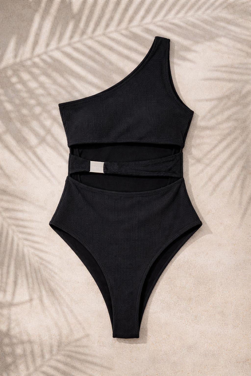 Fato de banho preto assimétrico, com abertura nas costas. Composição: 93%poliamisa , 7%elastano