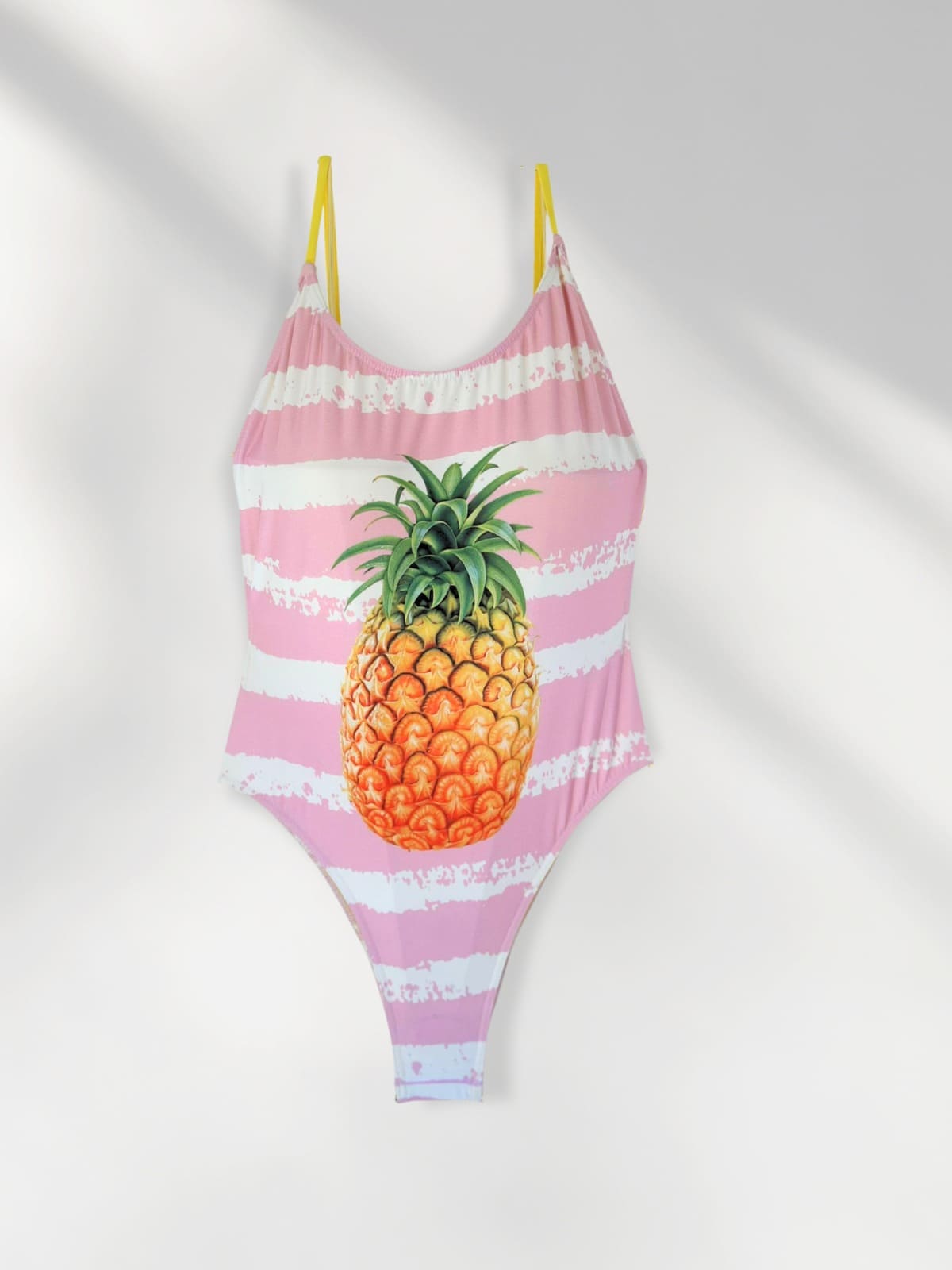 Este fato de banho da Ponto Chic destaca-se pelo seu design vibrante e descontraído, com padrão às riscas em tons de rosa combinado com o detalhe central de ananás, que lhe confere um toque tropical e irreverente.