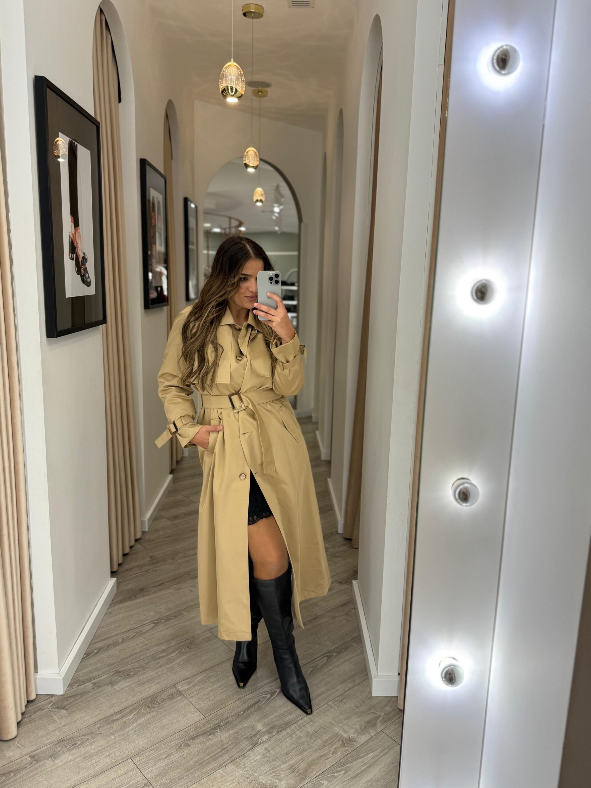 O seu design icónico destaca-se pela lapela estruturada, botões frontais e cinto ajustável que realça a silhueta com elegância. Na parte de trás, a aba com botões decorativos reforça o caráter distinto e refinado desta gabardine.