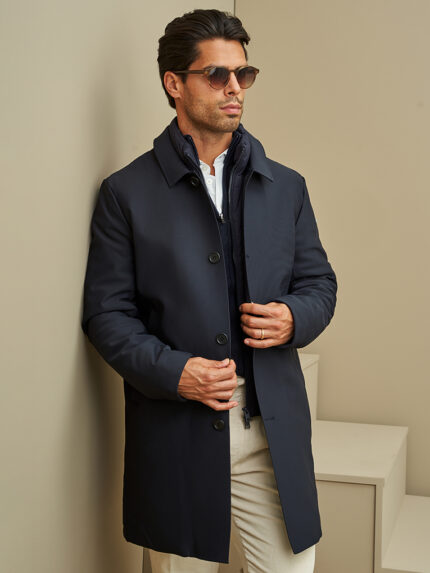 O design apresenta corte reto, gola clássica com interior acolchoado removível, fecho com botões e bolsos laterais embutidos — detalhes que refletem a atenção da marca ao equilíbrio entre estética e funcionalidade.