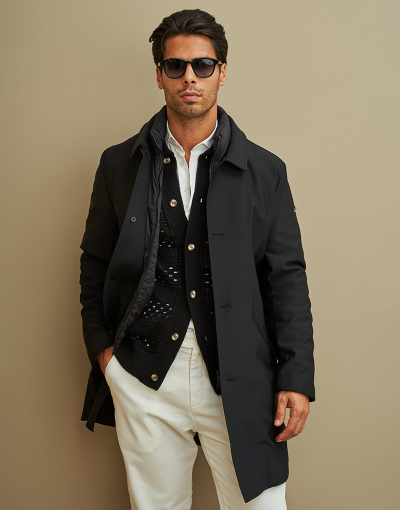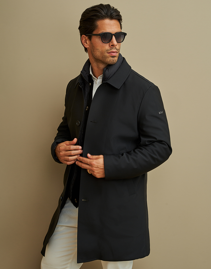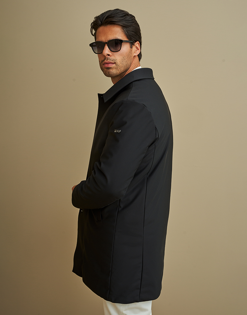 A gabardine impermeável preta Zolf é um ícone de elegância intemporal e sofisticação discreta. Produzida em 75% nylon e 25% elastano, com forro 100% nylon, combina leveza e elasticidade, garantindo conforto e proteção em dias de frio ou chuva.