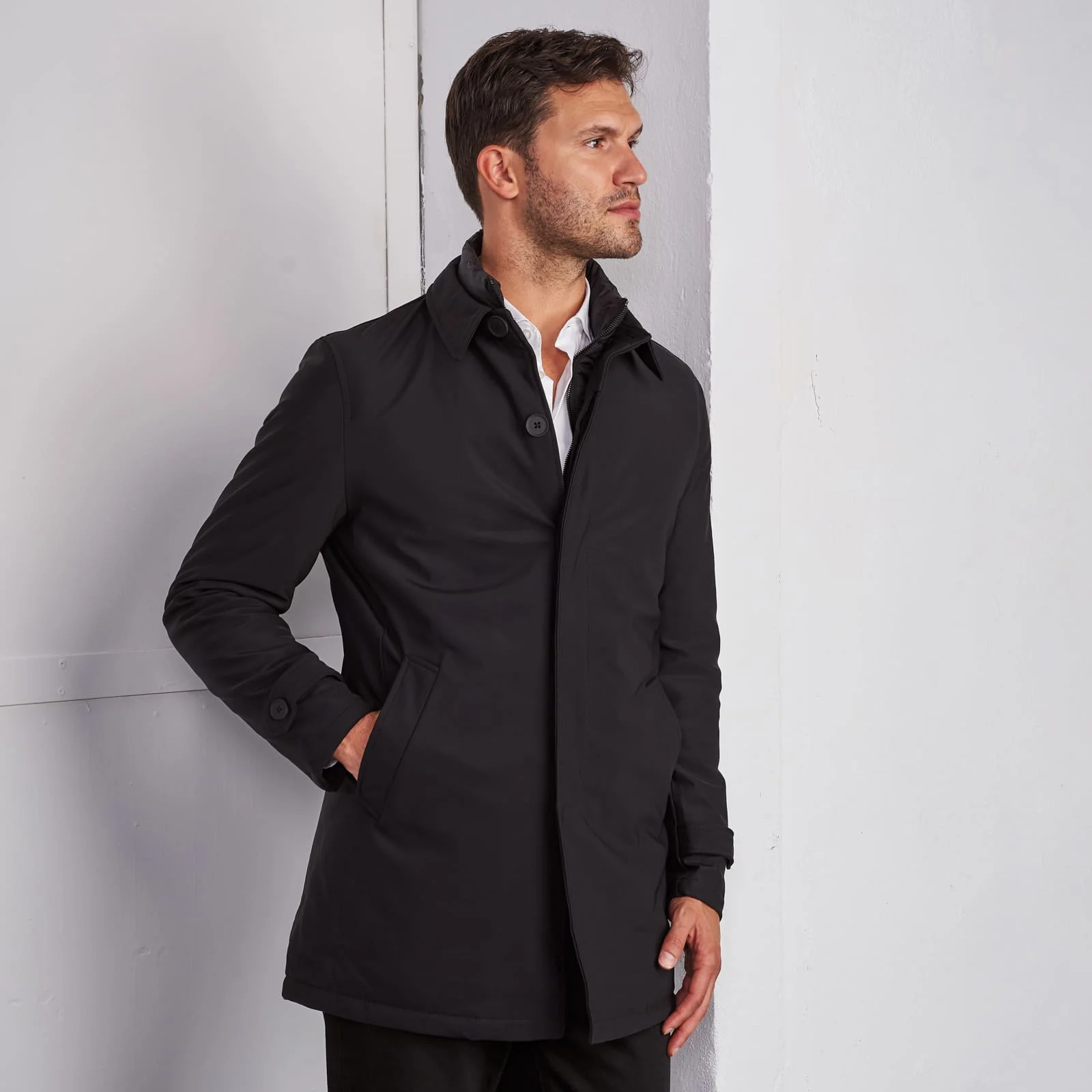 A gabardine técnica impermeável preta da Zolf é a peça-chave para o homem que procura sofisticação discreta, funcionalidade e conforto num só design. Confeccionada em tecido técnico resistente, com acabamento impermeável, oferece proteção eficaz contra vento e chuva sem perder a elegância característica da marca.