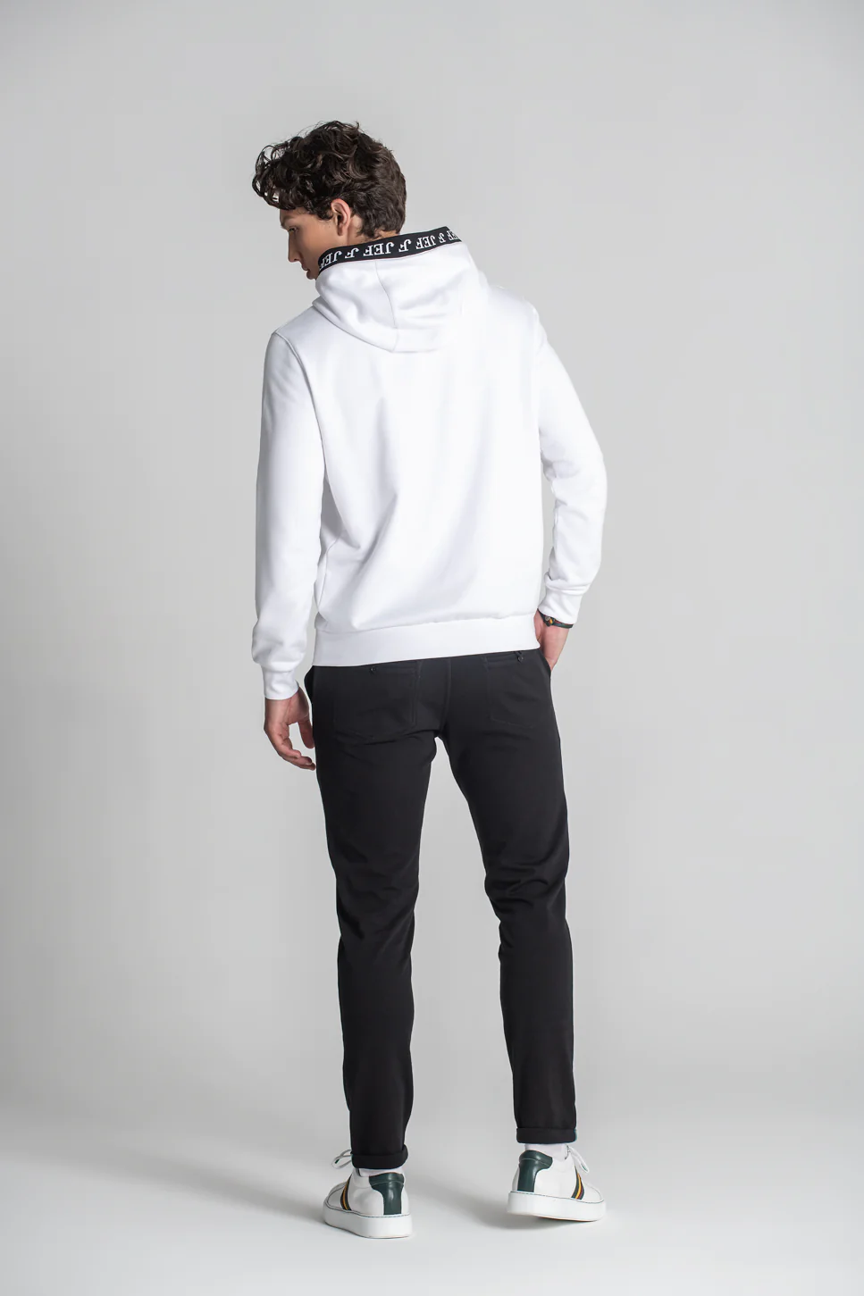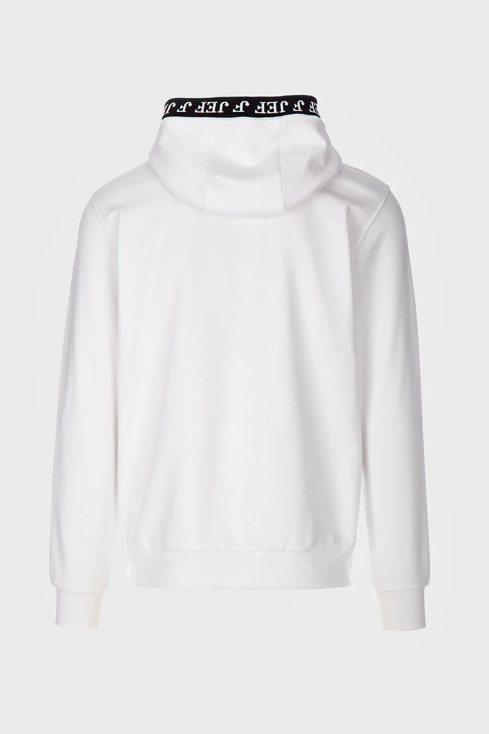 Modelo com capuz e corte descontraído, com destaque para o detalhe de fita com logótipo JEF no contorno do capuz, que acrescenta um toque moderno e diferenciador. Acabamentos em rib com mistura de algodão e elastano, proporcionando melhor ajuste ao corpo.