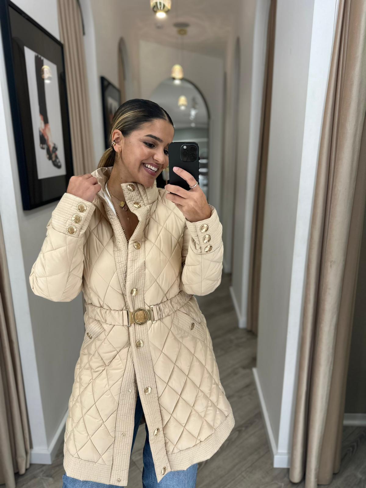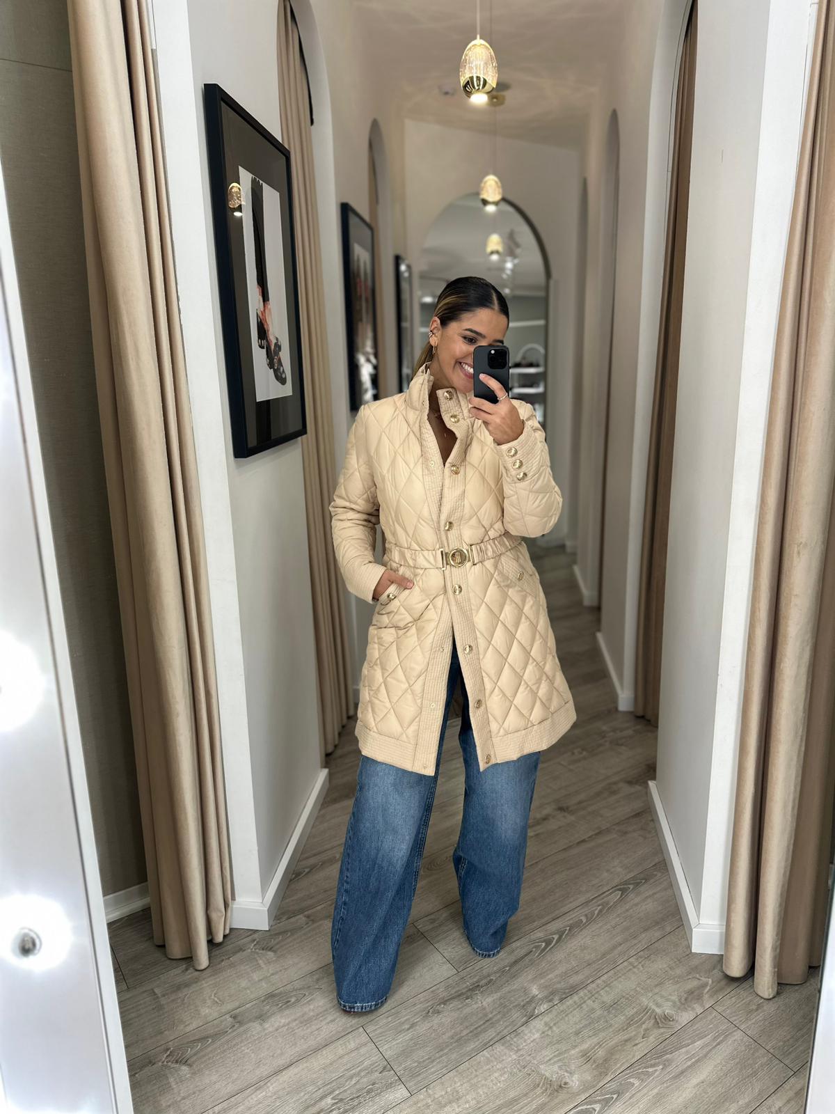 Jaqueta acolchoada, modelagem regular, gola alta, botões centrais para abertura, bolsos laterais, cinto na cintura e mangas compridas. Composição: 100% Poliéster Forro: 100% Poliéster
