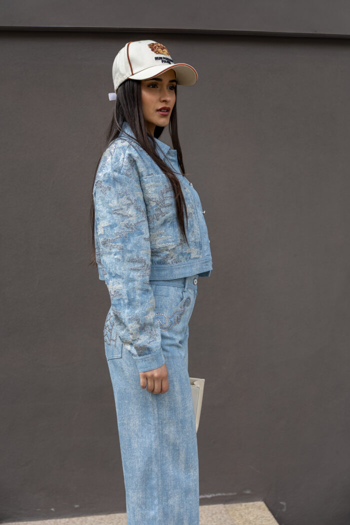 Blusão com gola de lapela e manga comprida acabada em punho. Bordado de lantejoulos, com Bolsos tipo pala na parte da frente. Fecho frontal com botões metálicos. A modelo mede 1,80 m e veste o tamanho S. 100% Algodão