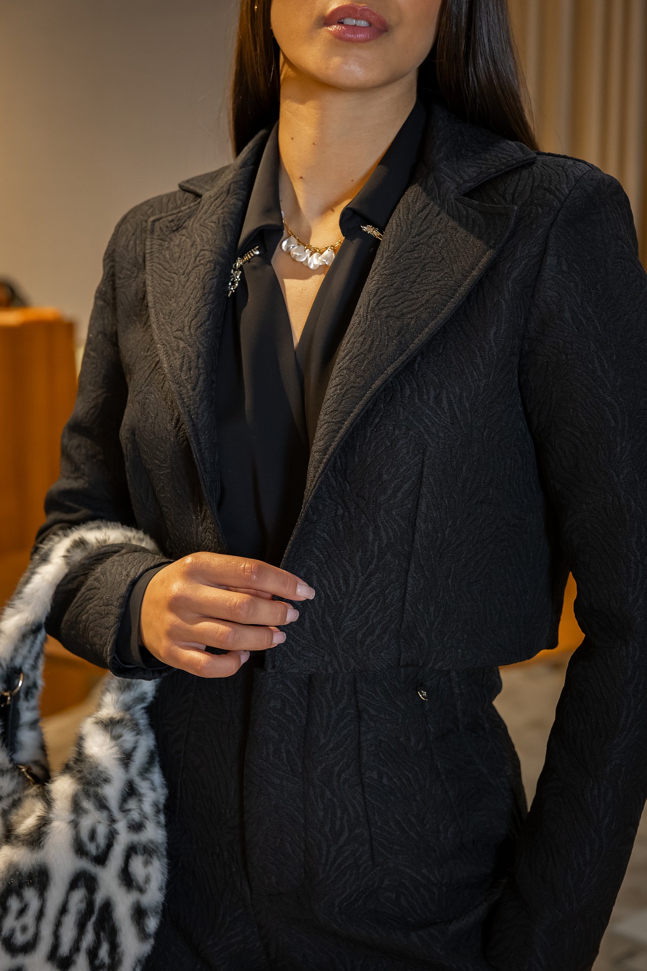 O blazer curto da marca Rinascimento combina elegância e modernidade num design estruturado e cheio de personalidade. Confeccionado em 98% poliéster e 2% elastano, com forro em 100% poliéster, apresenta um tecido texturizado em relevo que adiciona profundidade e sofisticação ao look.