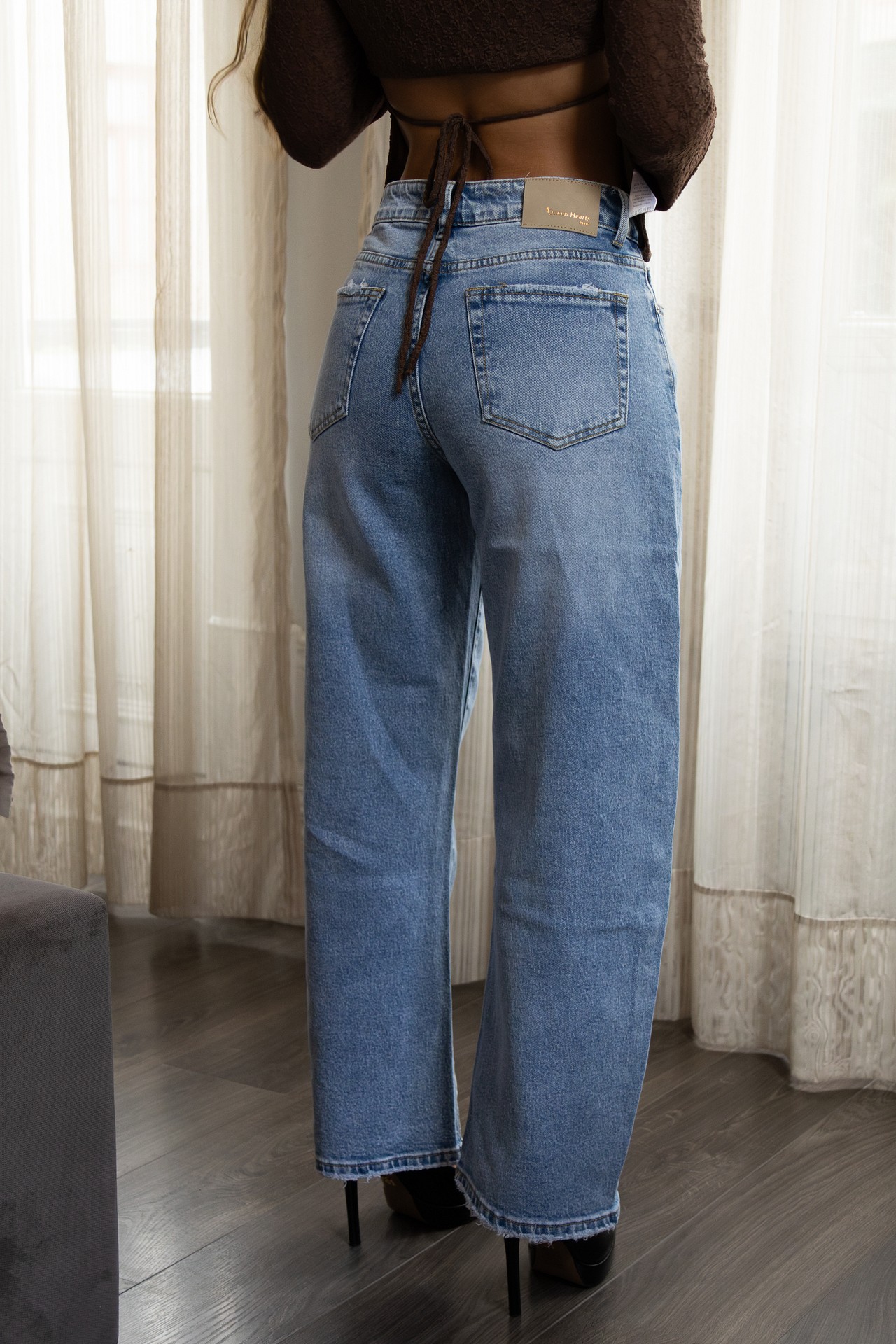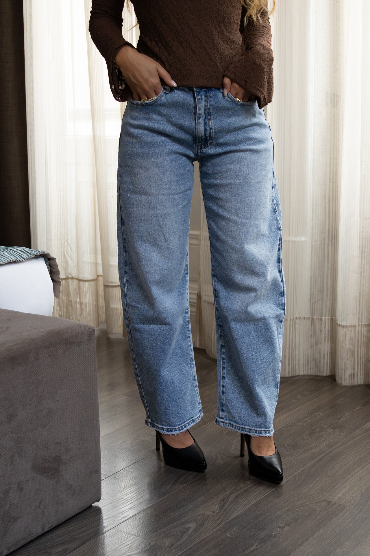 Com um corte balloon fit, de perna solta e ligeiramente afunilada, criam um efeito descontraído e trendy. O acabamento em lavagem azul médio, com detalhes de desgaste subtil, dá um ar vintage e urbano. A bainha desfiada acrescenta personalidade e um toque irreverente ao modelo.