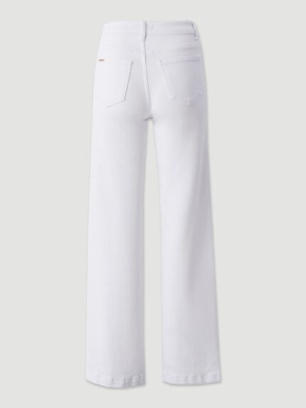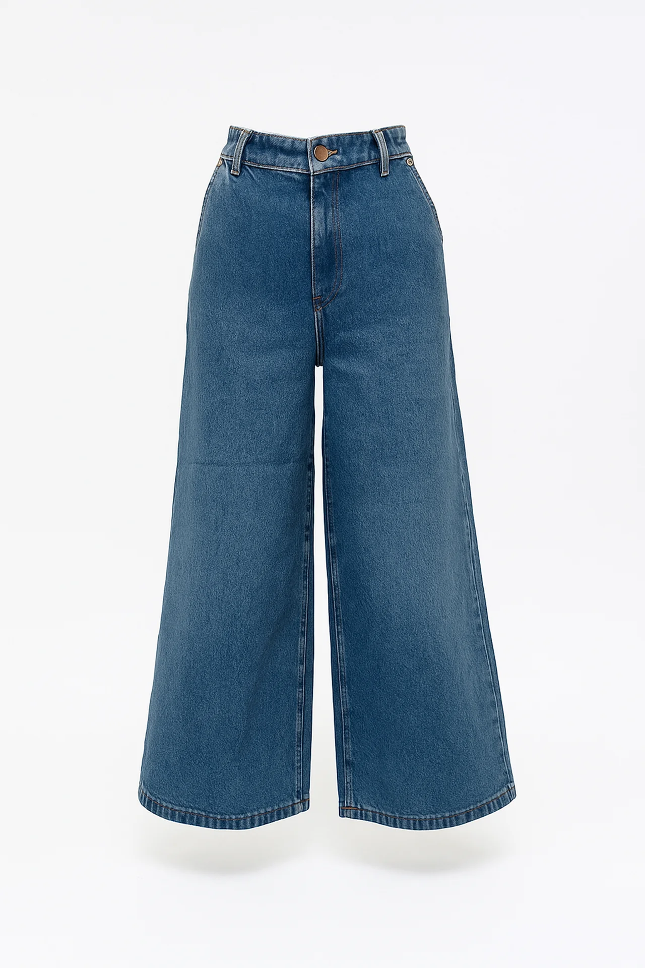 Com cintura subida, corte culotte largo e uma lavagem azul médio intemporal, este modelo apresenta a identidade premium da marca em cada detalhe: desde os rebites e botão metálico dourado até à placa triangular Sahoco no bolso frontal. A bainha ligeiramente desfiada acrescenta um toque cool e atual ao design.