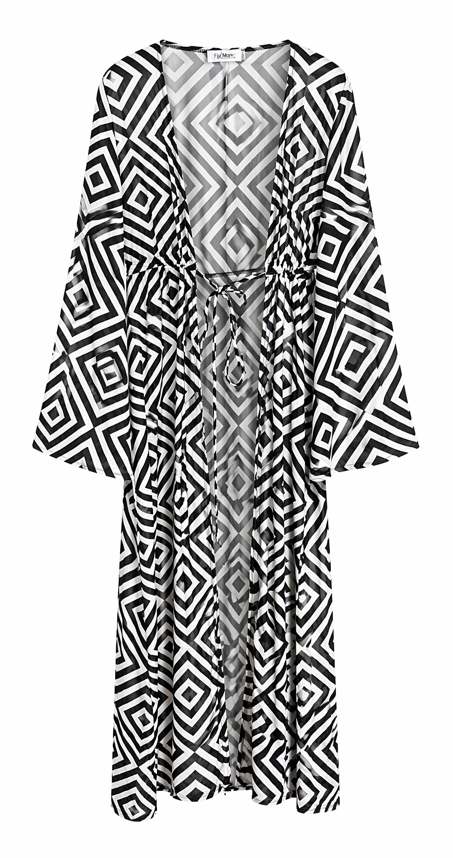 Destaca-se pelo padrão geométrico em preto e branco, que cria um efeito visual moderno e sofisticado. Apresenta decote aberto, mangas compridas e corte solto, complementado por amarração frontal ajustável que permite marcar a silhueta de forma elegante.