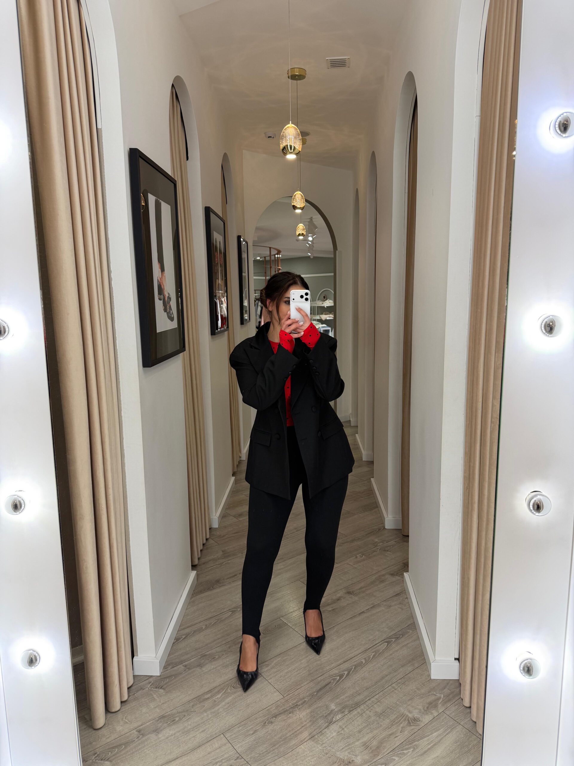 Legging preta de corte justo, pensada para criar uma silhueta alongada e contemporânea. O grande destaque do modelo é a presilha na parte inferior, que encaixa no pé e mantém a peça perfeitamente esticada, garantindo um efeito elegante e estruturado.
