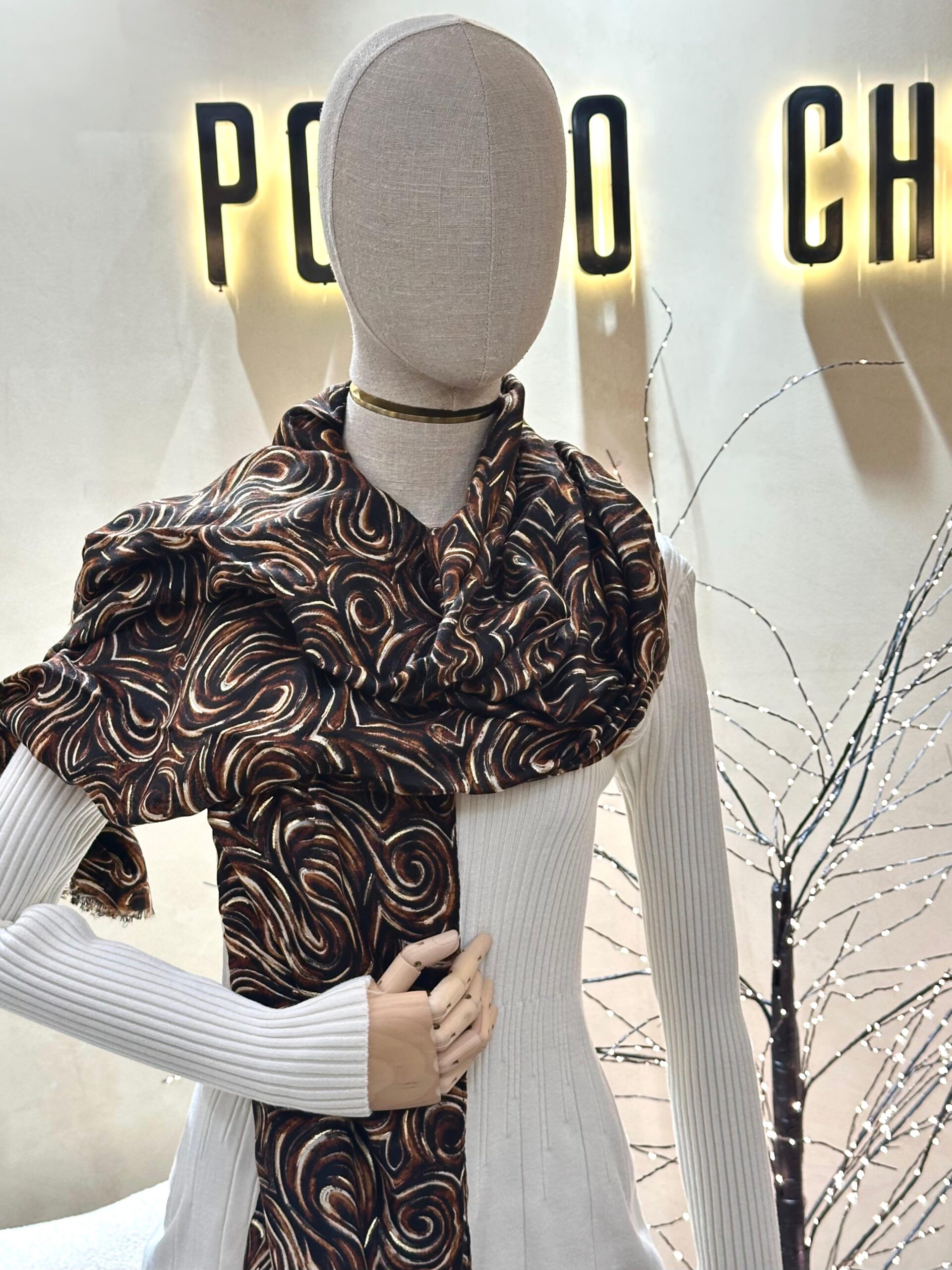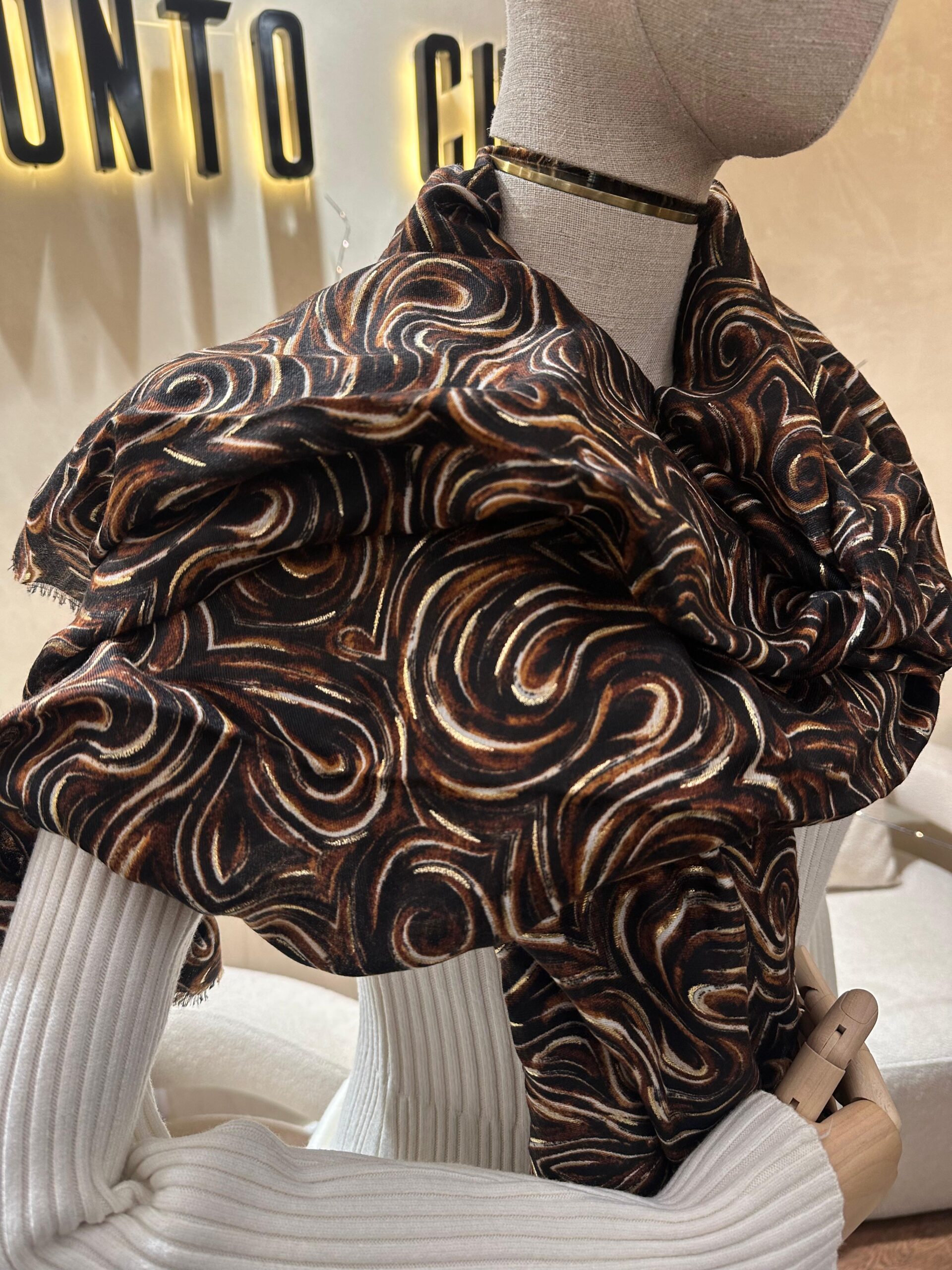 O lenço castanho escuro da marca Ponto Chic é uma peça rica e elegante, ideal para quem aprecia tons terrosos e discretos com um toque de sofisticação. O padrão ondulado com detalhes dourados acrescenta profundidade e brilho ao tecido, resultando num acessório requintado.