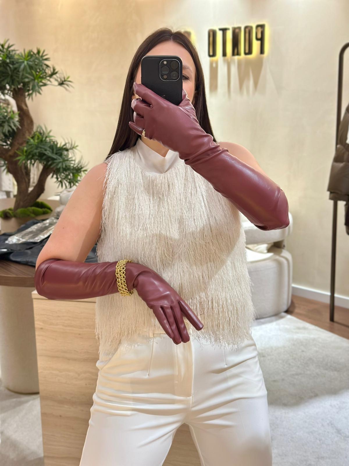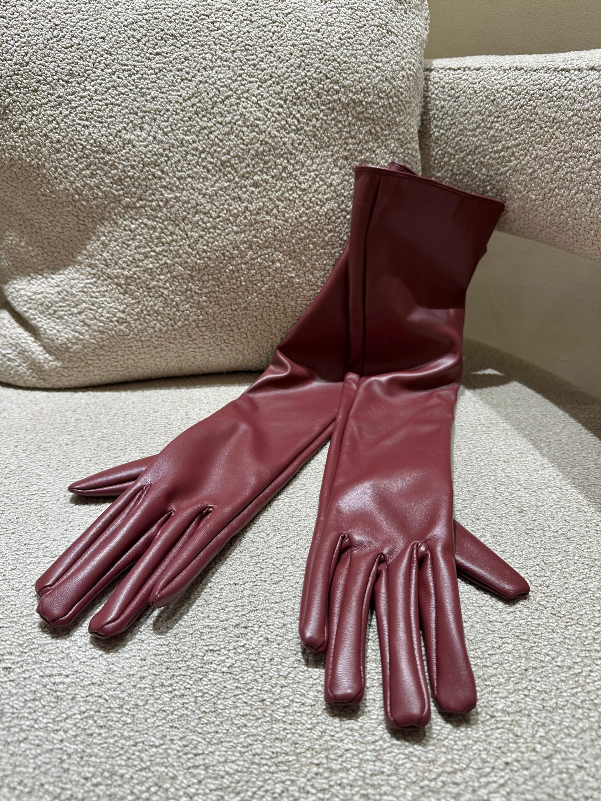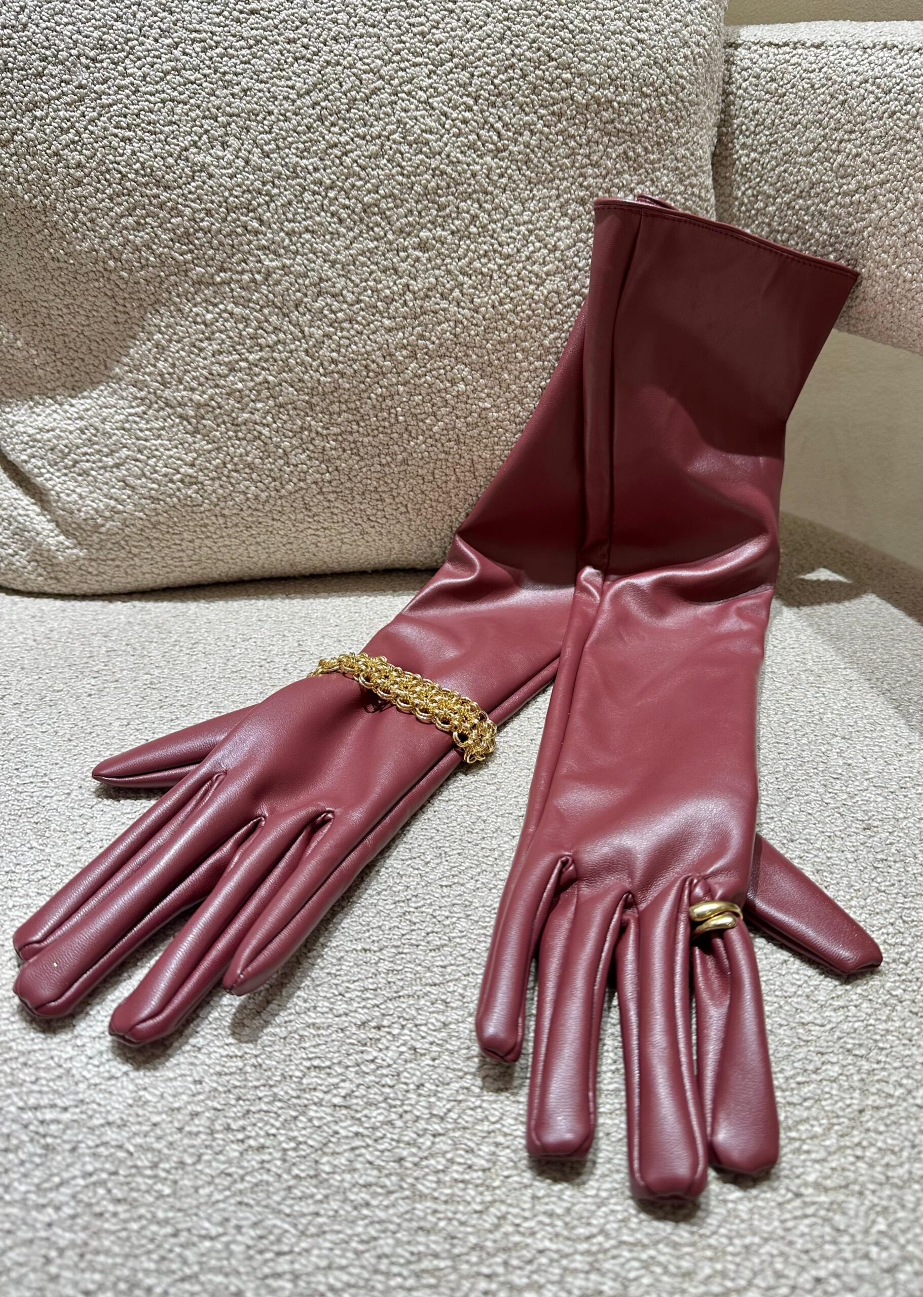 O design alongado, que ultrapassa o cotovelo, adiciona dramatismo e estilo — ideal para combinar com vestidos sem mangas, casacos estruturados ou peças de alfaiataria. A cor bordô traz profundidade e requinte, tornando-as o detalhe de destaque em produções mais neutras.