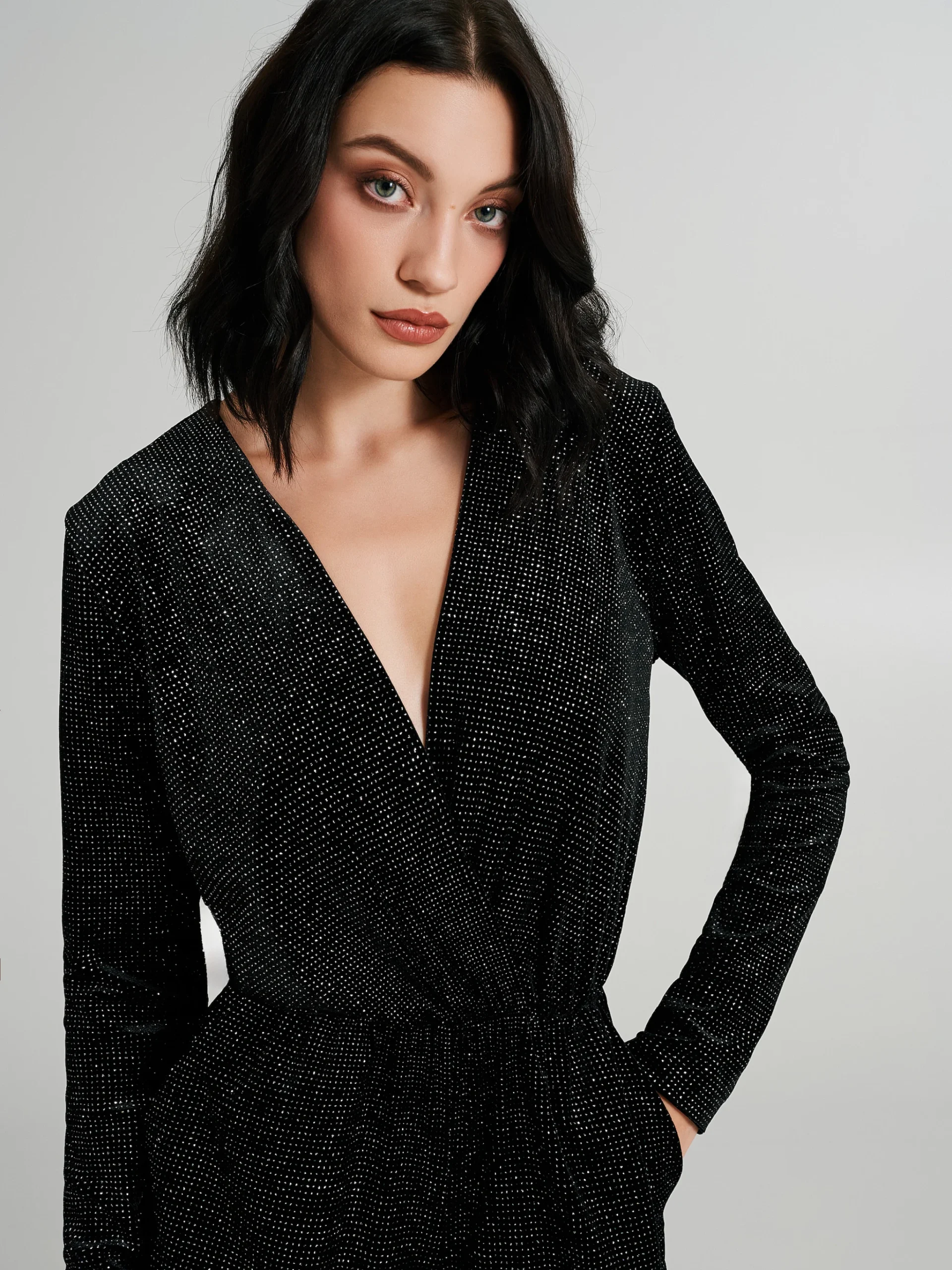 O design de manga comprida com decote em V equilibra sensualidade e sobriedade, enquanto o acabamento luminoso em tecido brilhante reflete a luz de forma subtil, tornando-o ideal para eventos noturnos e festas. O cinto na cintura ajuda a definir a silhueta, criando um look moderno e refinado.