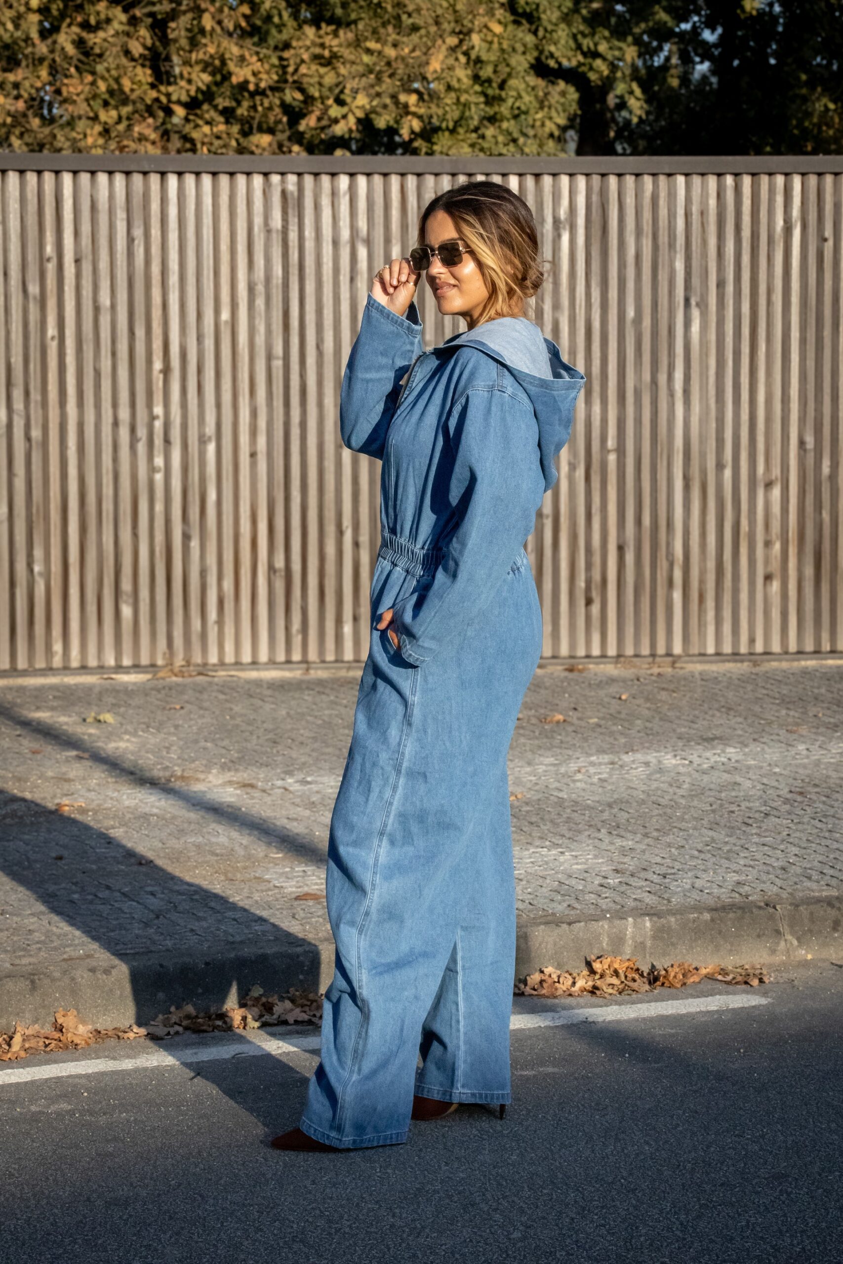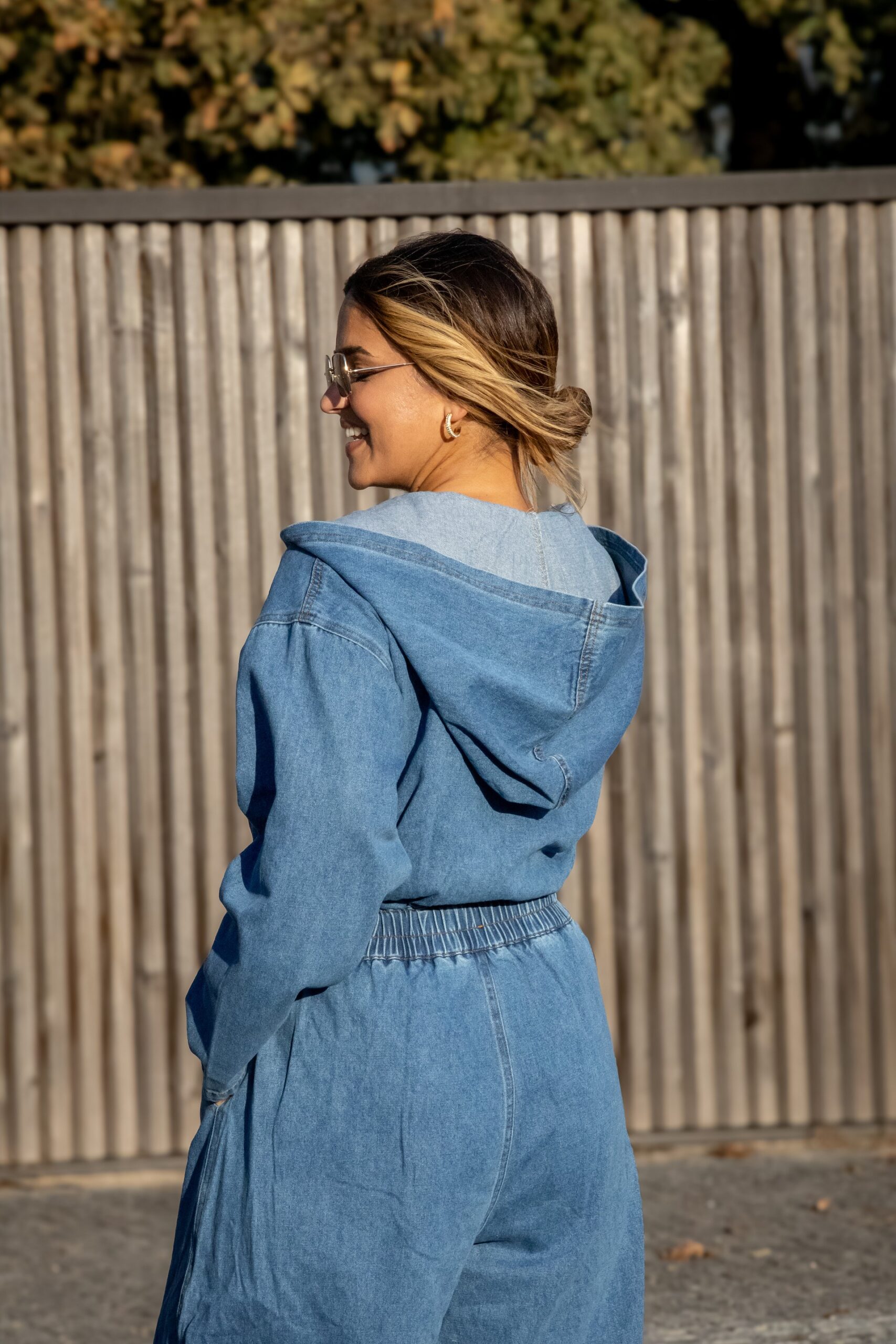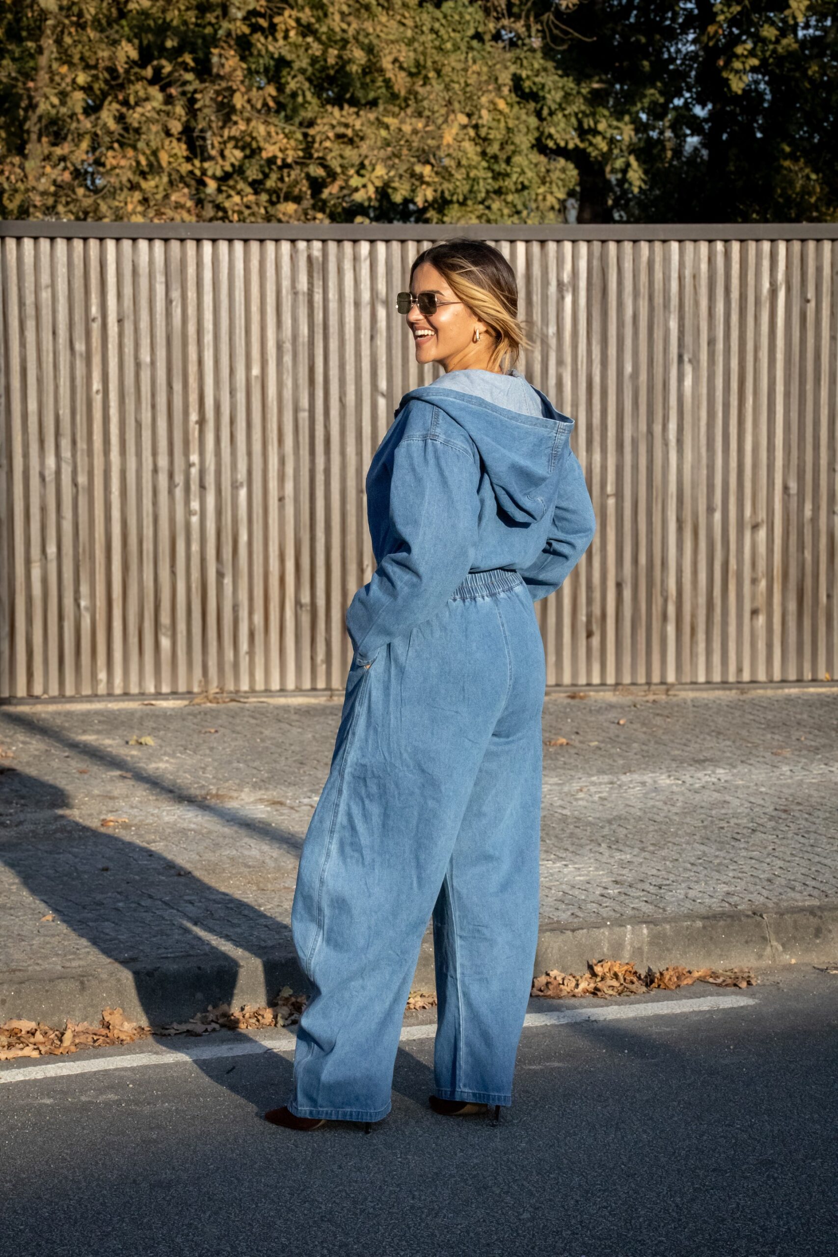 Macacão de ganga da marca Pontixque, confeccionado em 100% algodão para máximo conforto e respirabilidade. O modelo apresenta capuz integrado, fecho de correr frontal e detalhe de elástico na cintura que realça a silhueta sem perder a descontração. Versátil e moderno, este macacão pode ser usado tanto em looks casuais de dia a dia como em combinações mais arrojadas com acessórios para saídas urbanas.