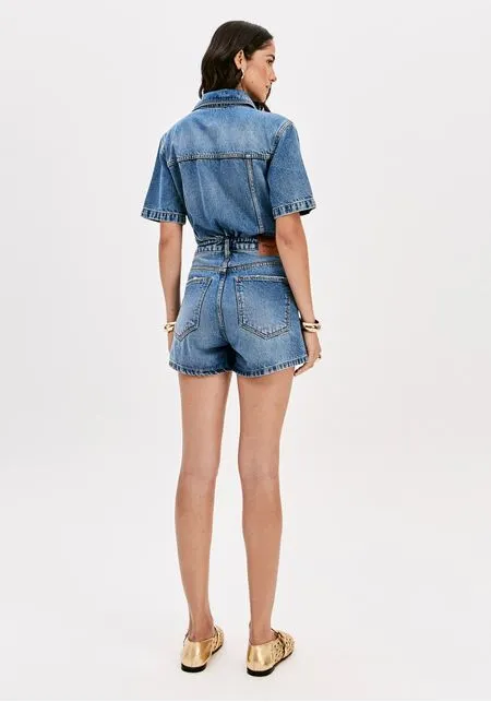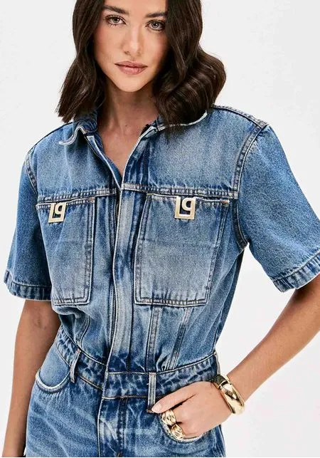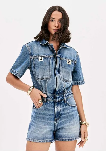 Macacão curto em ganga azul, confeccionado em 100% algodão no corpo principal. Modelo de manga curta, gola estruturada e fecho frontal com fecho metálico dourado.