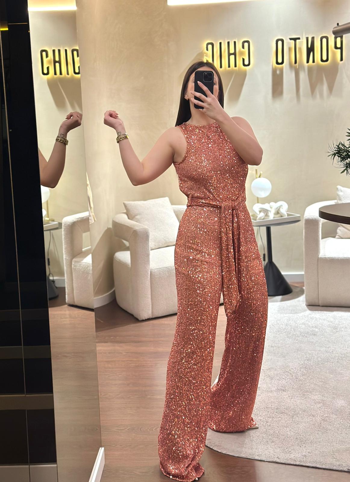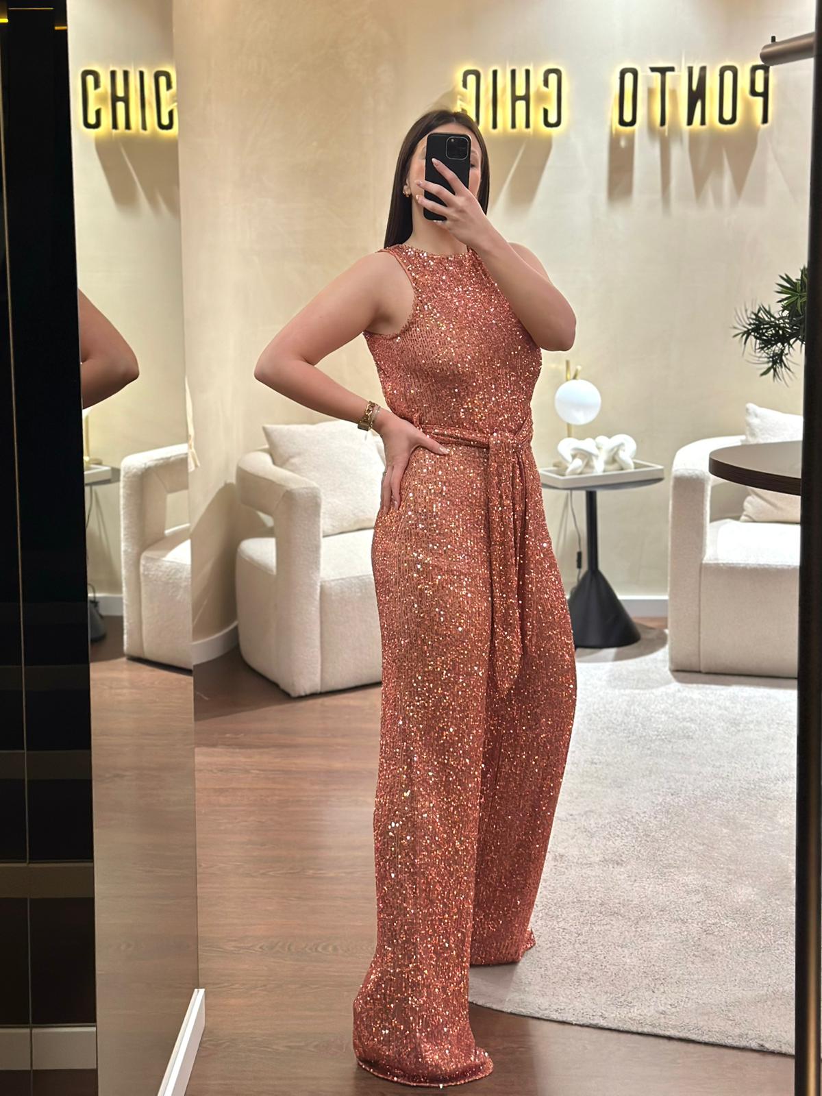 Macacão longo de presença marcante, totalmente revestido a tule com aplicação de lantejoulas em tom laranja intenso, ideal para eventos especiais onde o brilho e a confiança são protagonistas.