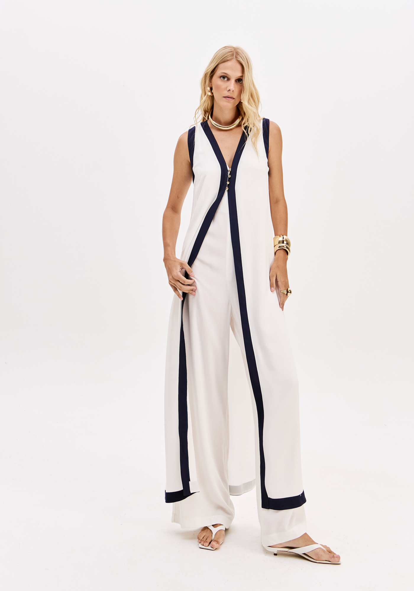 Peça estruturada e sofisticada, composta por macacão longo branco com colete sobreposto em contraste azul marinho, unidos entre si através de aplicação cosida que cria um elegante efeito de conjunto coordenado.