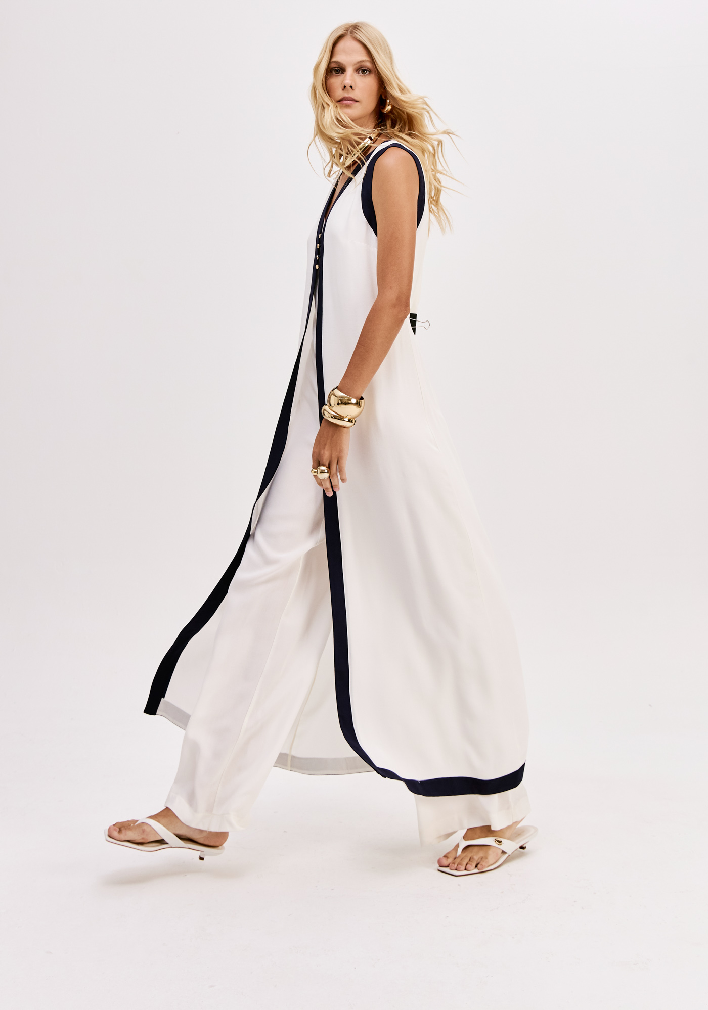 O macacão apresenta corte fluido e perna ampla, proporcionando movimento e imponência à silhueta. O colete define a parte superior da peça, valorizando o decote em V e criando uma linha vertical alongadora através da aplicação frontal contrastante. Os botões dourados acrescentam um detalhe refinado e distintivo.