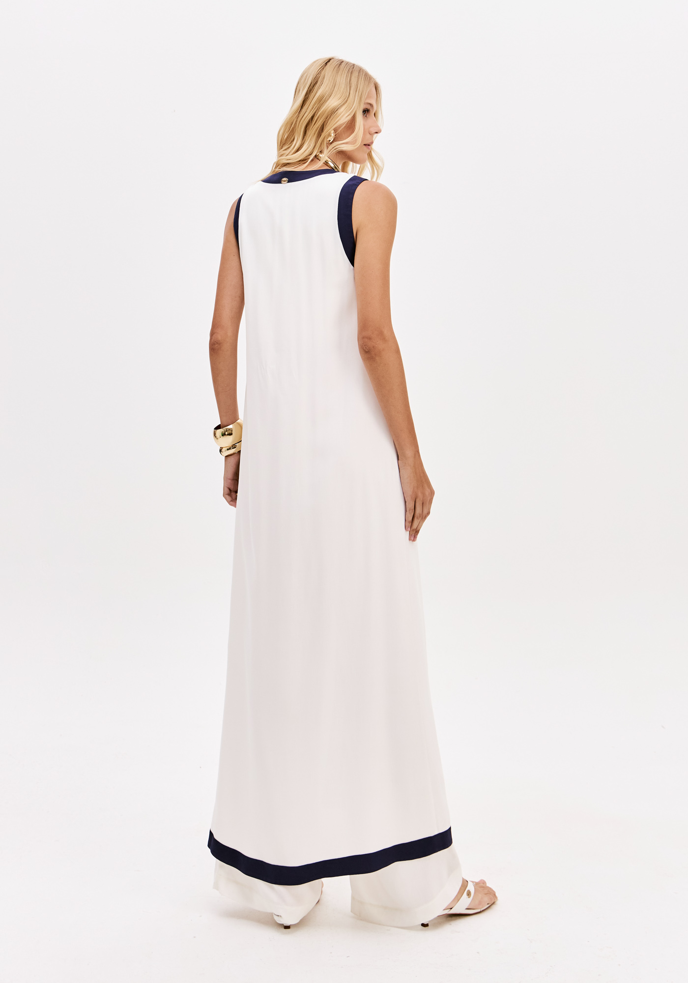 Os acabamentos em azul marinho nos ombros e na bainha reforçam a estética contemporânea com inspiração náutica sofisticada.