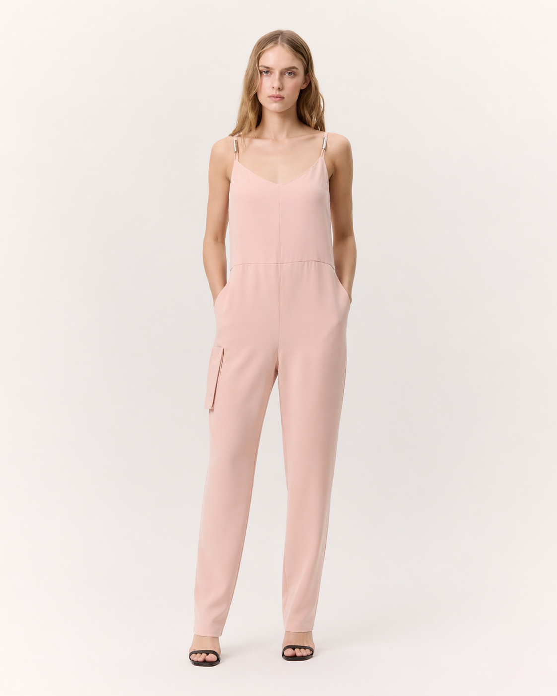 MACACÃO COM APLICAÇÃO DE BOLSO NA FRENTE. ALÇAS COM PORMENOR DE APLICAÇÃO EM PRATEADO. BOLSOS LATERAIS. FECHO INVISIVEL NA COSTA. 96% POLIÉSTER 4% ELASTANO