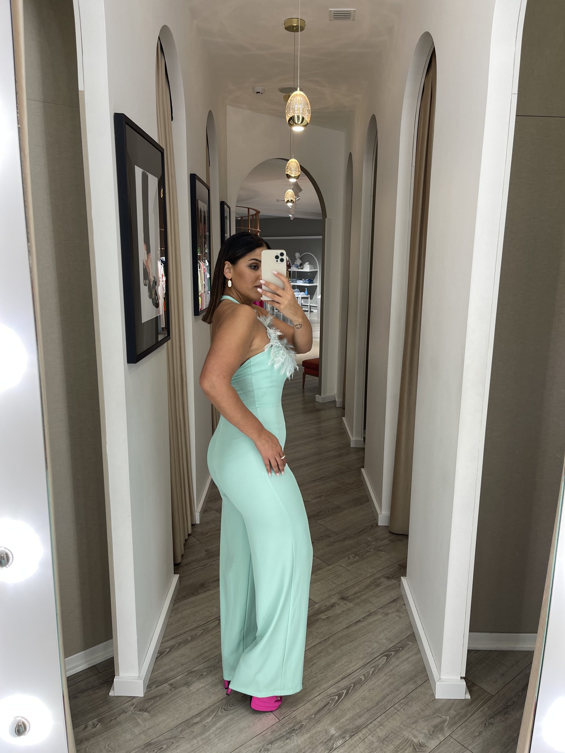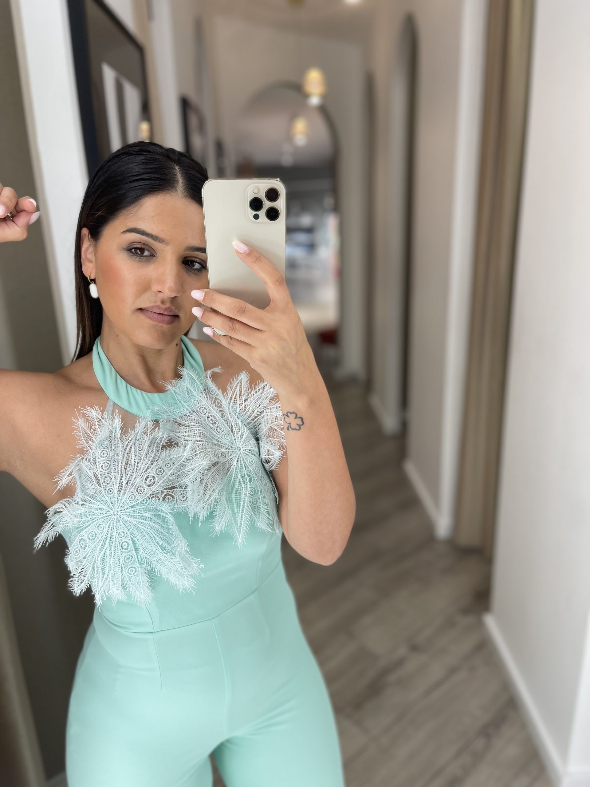 Macacão elegante em tom verde água suave, pensado para cerimónias e eventos onde o detalhe faz toda a diferença.
