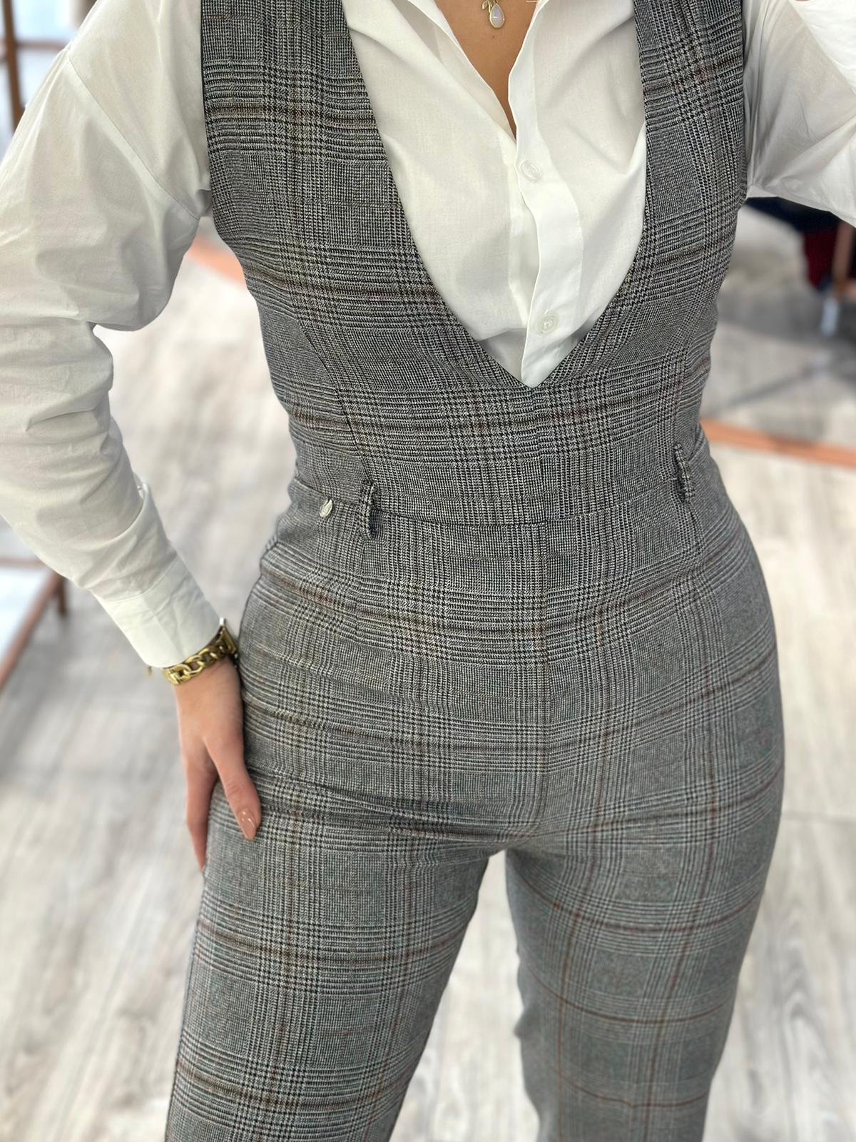 O padrão xadrez em tons de cinza, preto e subtis apontamentos avermelhados traz uma estética clássica reinterpretada de forma contemporânea. O decote em V estruturado alonga a silhueta e dá um toque moderno ao design. A cintura bem definida, os detalhes de pesponto e o corte direito das pernas criam uma linha alongada e extremamente elegante, garantindo equilíbrio entre formalidade e estilo.