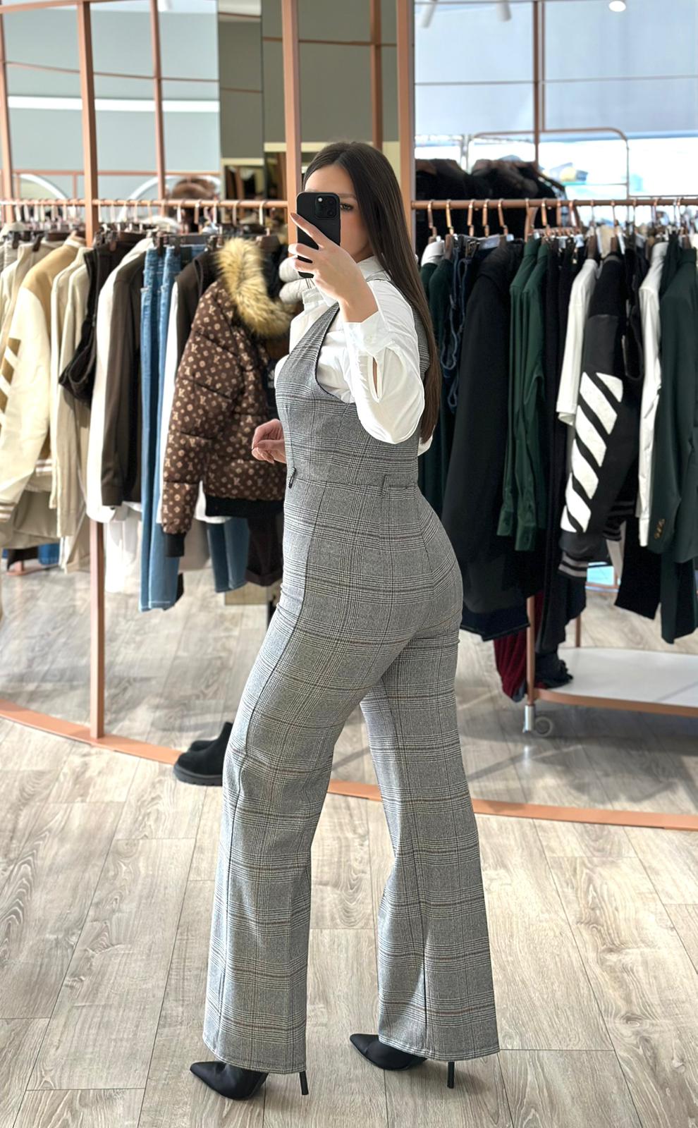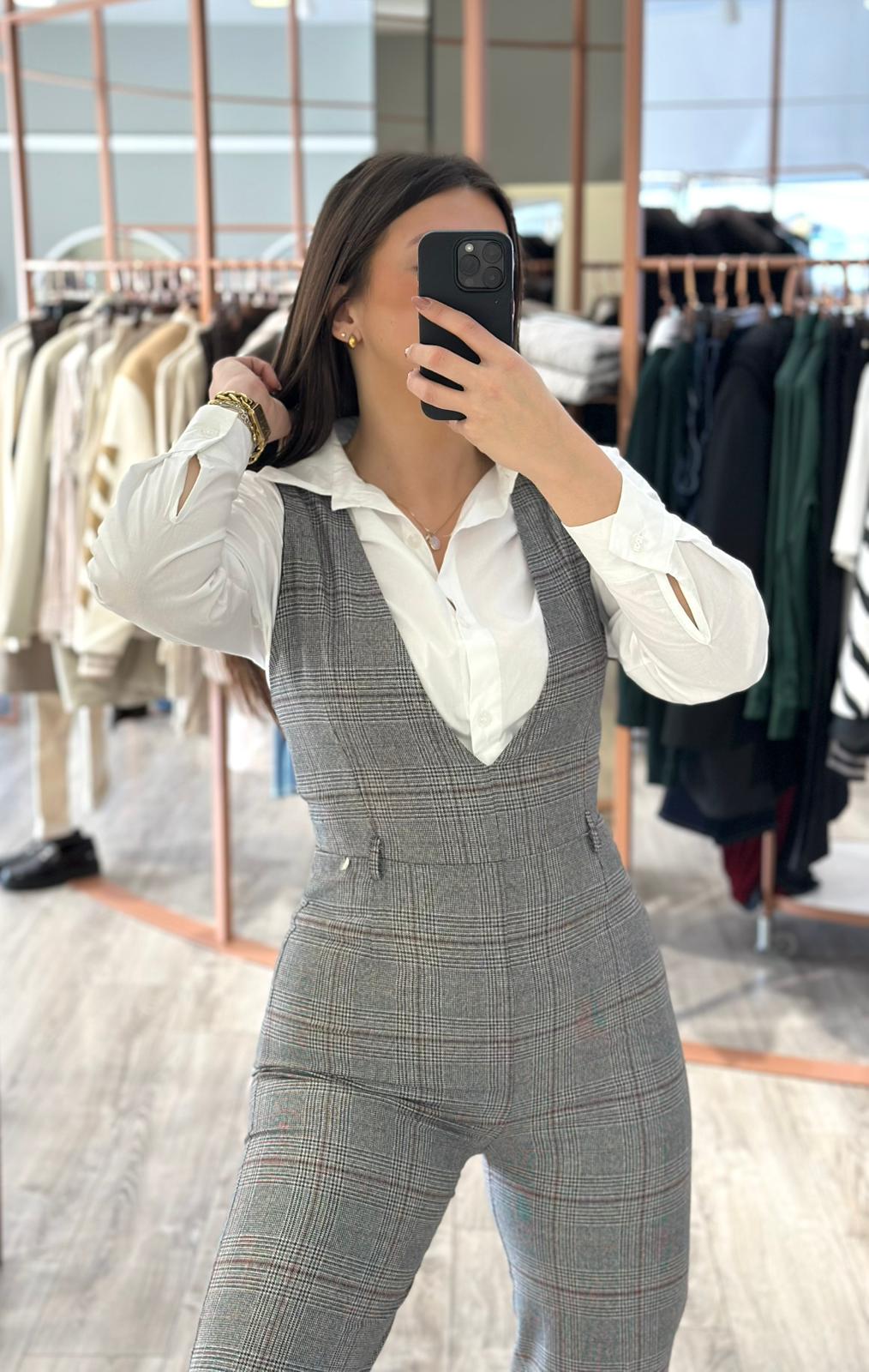 MACACÃO XADREZ CINZA DE DECOTE