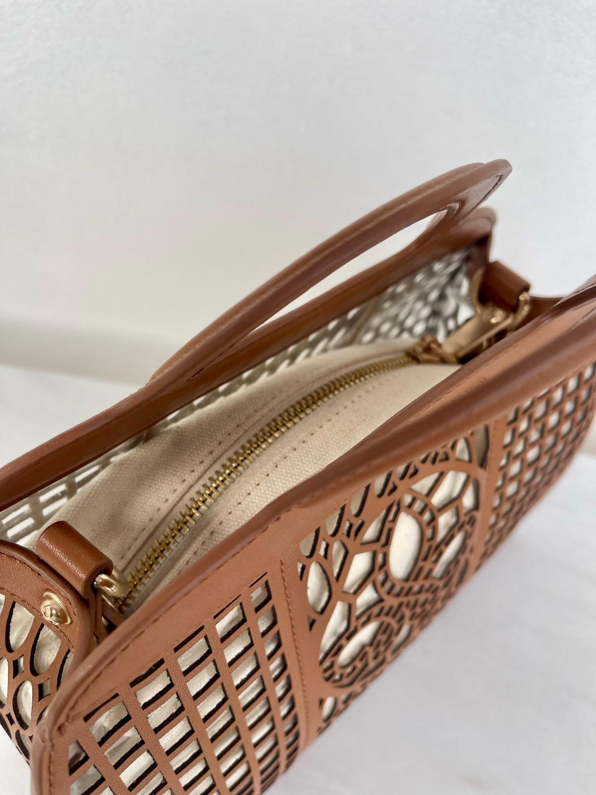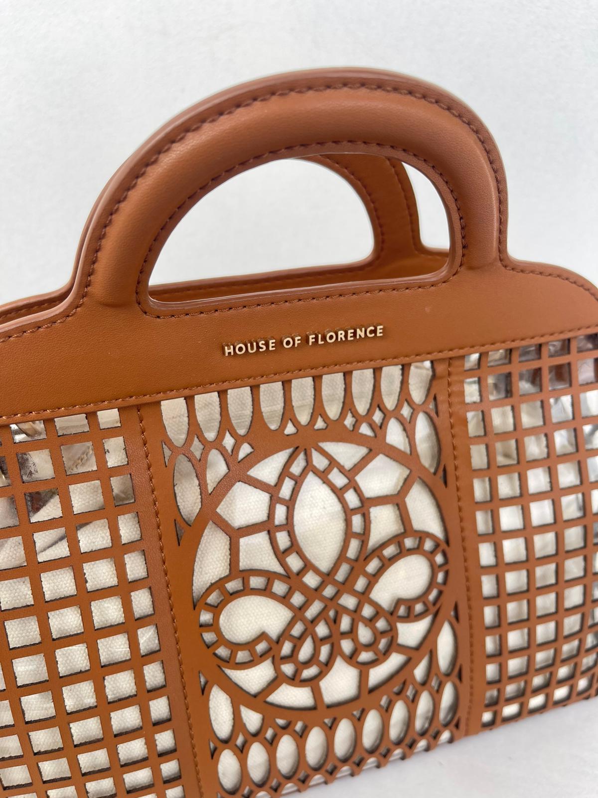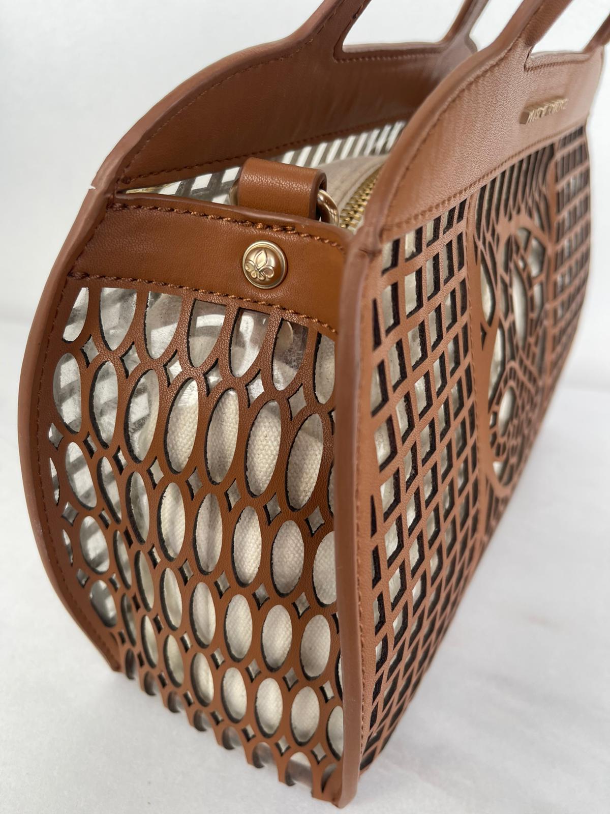 A Mala Castanha House of Florence destaca-se pelo seu design recortado a laser, criando um padrão elegante e arquitetónico que confere personalidade imediata ao look. A estrutura rígida em efeito pele dá-lhe forma e presença, enquanto o saco interior em tecido bege acrescenta praticidade e um acabamento sofisticado.